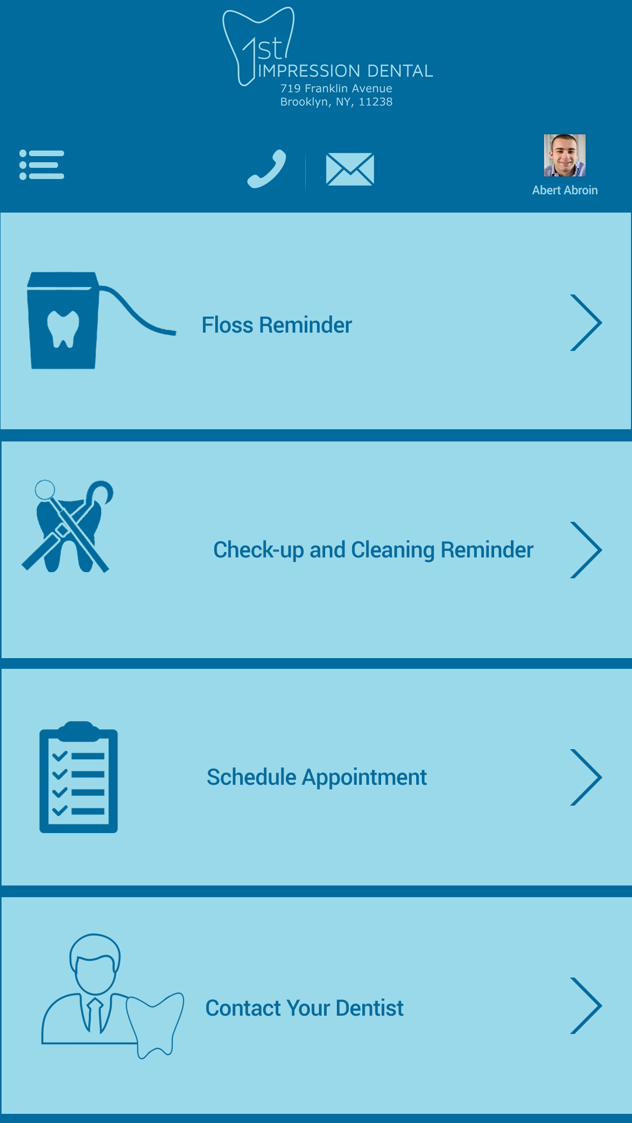 1. The 4 icons for "floss reminder", "Check-up and cleaning Reminder", "Schedule Appointment", and "Contact Your Dentist" options should be re-designed. I am looking for similar silhouettes with the same color, but more professional looking.