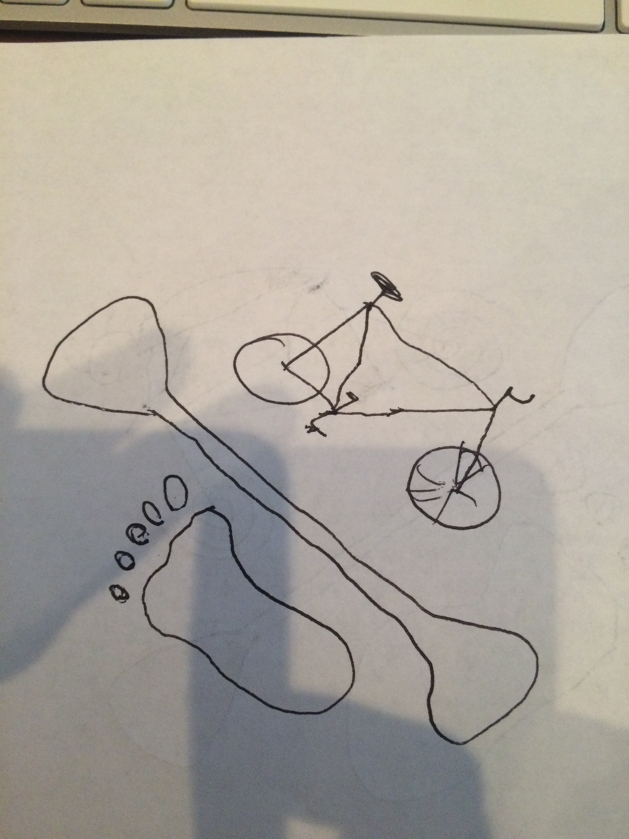 - Kayak Paddle diagonally in middle, footprint underneath paddle facing diagonally upwards, bicycle facing diagonally downwards. These 3 images should be spaced and not touching each other. I want it in black and white, just an outline.