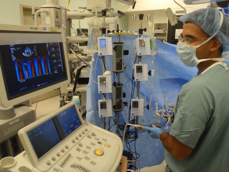 Please note: one of the classic pieces of equipment which distinguishes cardiac anaesthetists from others is that we regularly utilise "transesophageal echocardiography" in our cases - this is a distinctive piece of equipment (consists of a probe and machine, see attached) which would be immediately recognised by those in our field. Other ideas would relate to schematics of the heart and lung which is the focus of the surgery for which we anaesthetise, or the anaesthetic monitor we use during surgery.