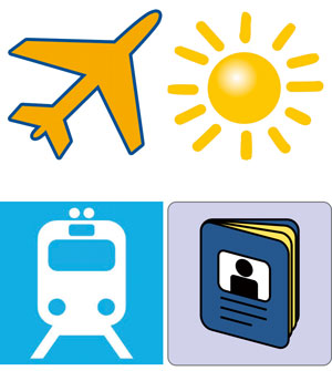 We wish for a following composition: the advertising should picture four symbols for a plane, a sun, a train and a passport/visa. Each of the symbols could be on a different colored background. (The wall, where the advertising will be mounted is yellow, the sign is mounted at the third floor, c.a. 7m above the ground). We have drafted a quick drawing showing the general idea.