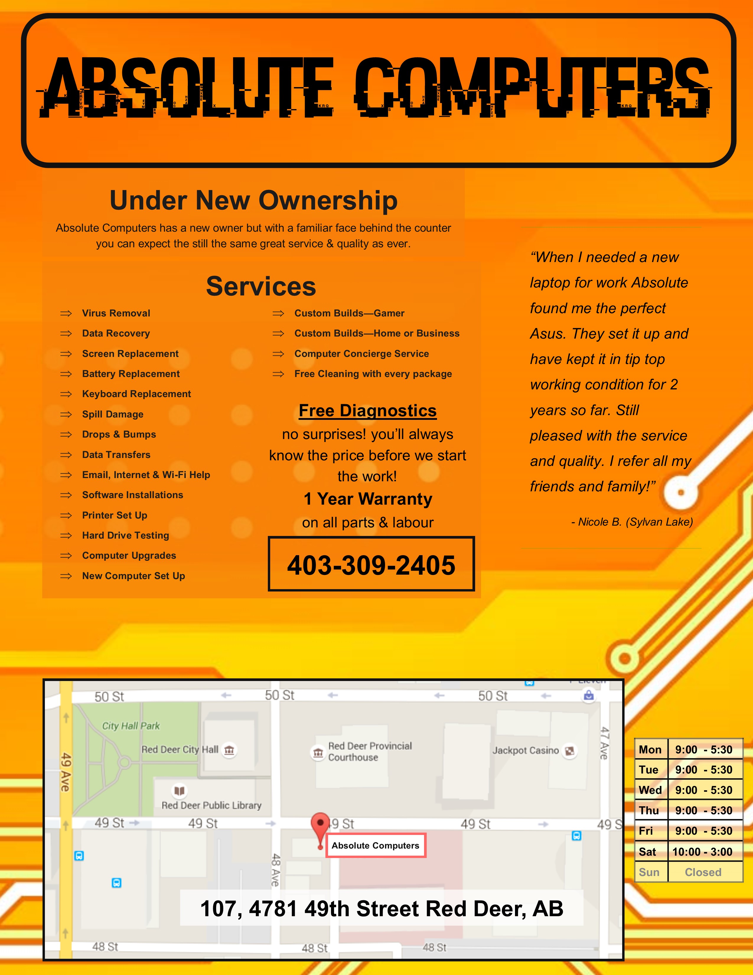 An established computer repair shop with a new owner wants a business card that is his own. Keeping with the tradition of the shop the card should be clever with a bold background colour(s). We want to portray a sense of continuity from the last branding because the only thing that changed is the owner. Reliable services, quality parts, fast, friendly, helpful, affordable are still the same and key to the business philosophy.