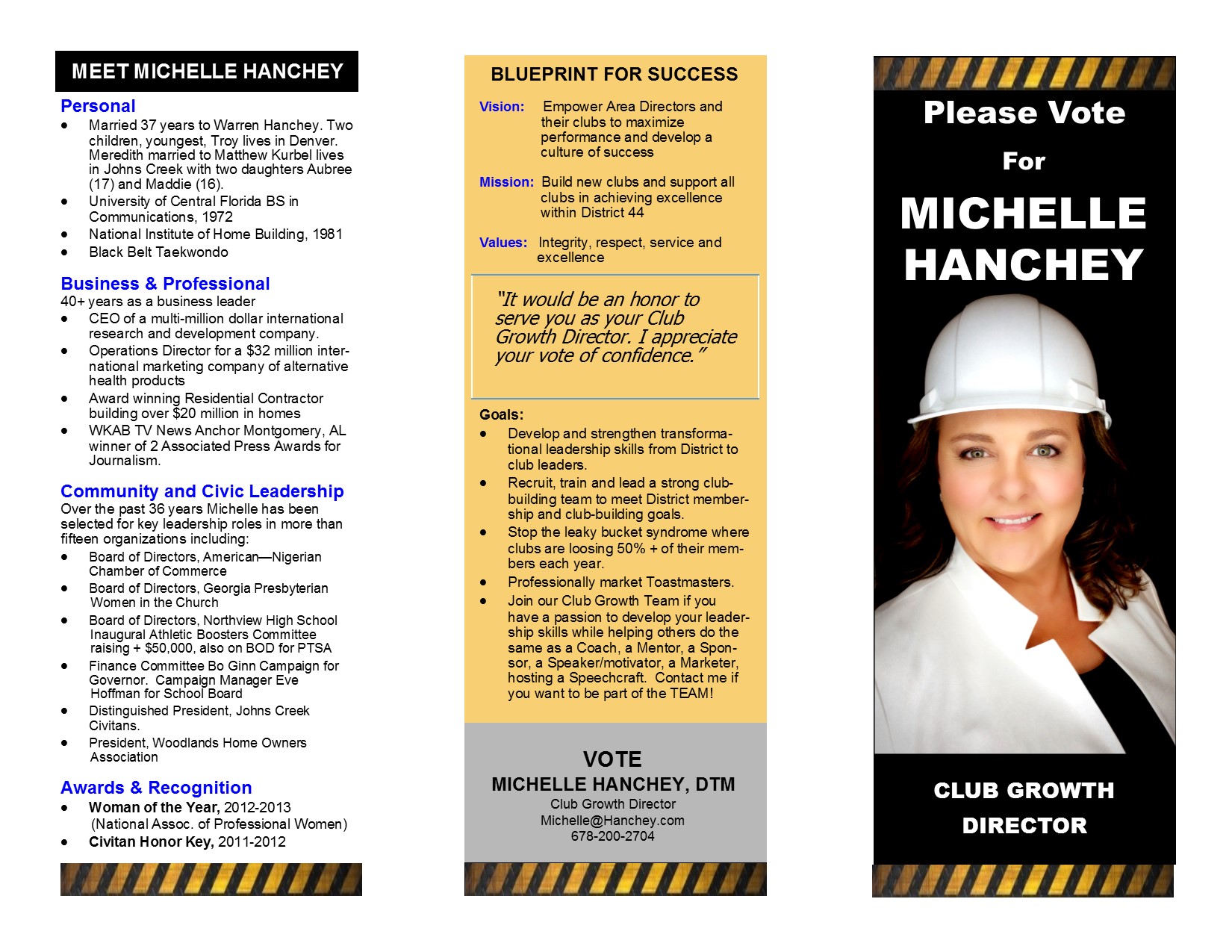 This is a tri-fold brochure. I have a basic layout from last years election but would like to add some detail and punch to the campaign brochure. I have a sample from last year. I've also included a sample of a brochure with some depth and personality. The design should communicate that I am a transformational leader who has a solid foundation in helping others to build a better Toastmaster experience. If you have the winning design I will need business cards, post cards, and a poster.