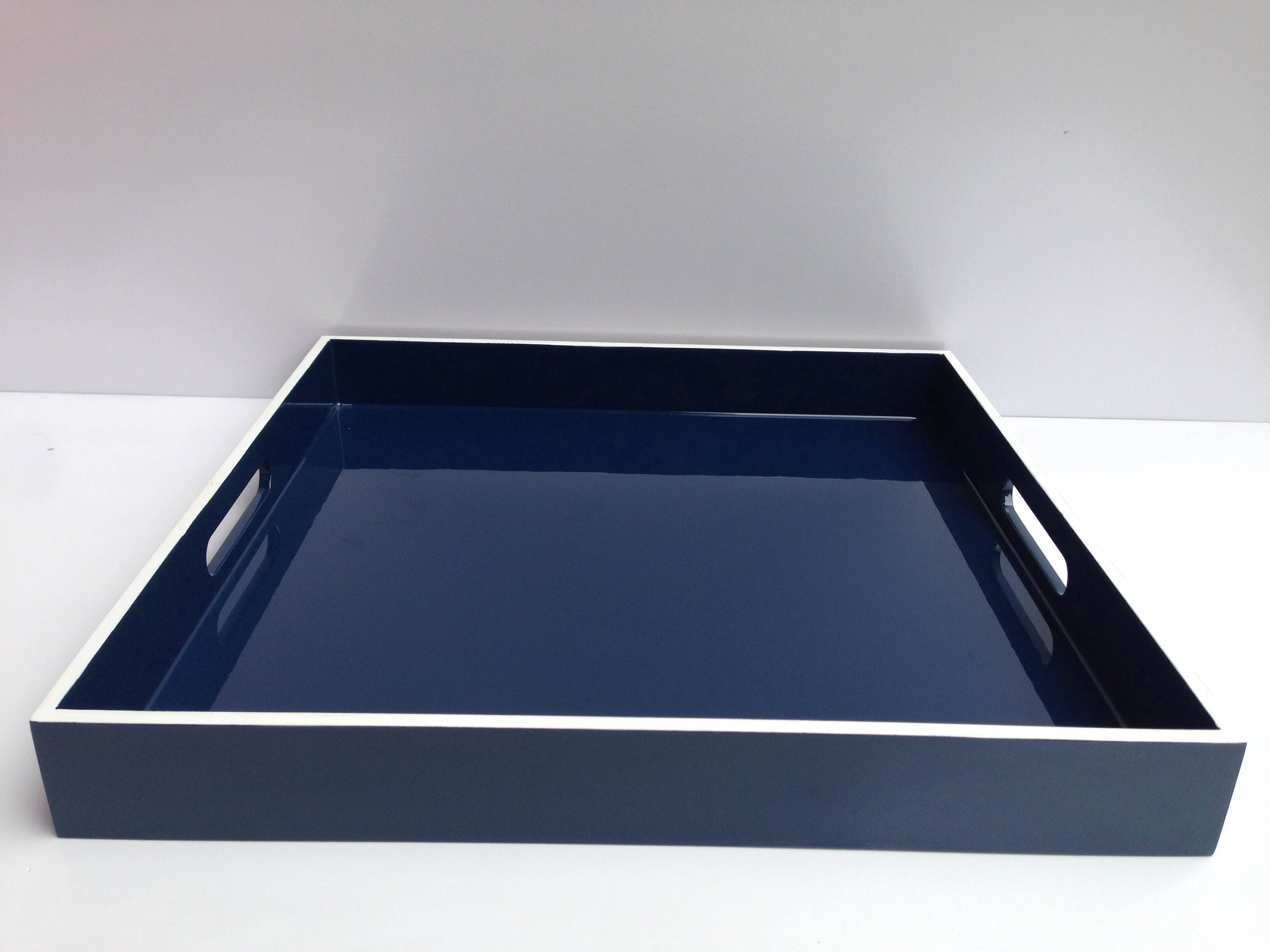 Image of the trays is attached.It can be made with or without the white edge. The colour of this tray is Pantone Poseidon which I absolutely love and could see it working back with grey, white and perhaps a mint or teal colour??? But not necessarily these colours???I am looking for some creative input. thanks so much