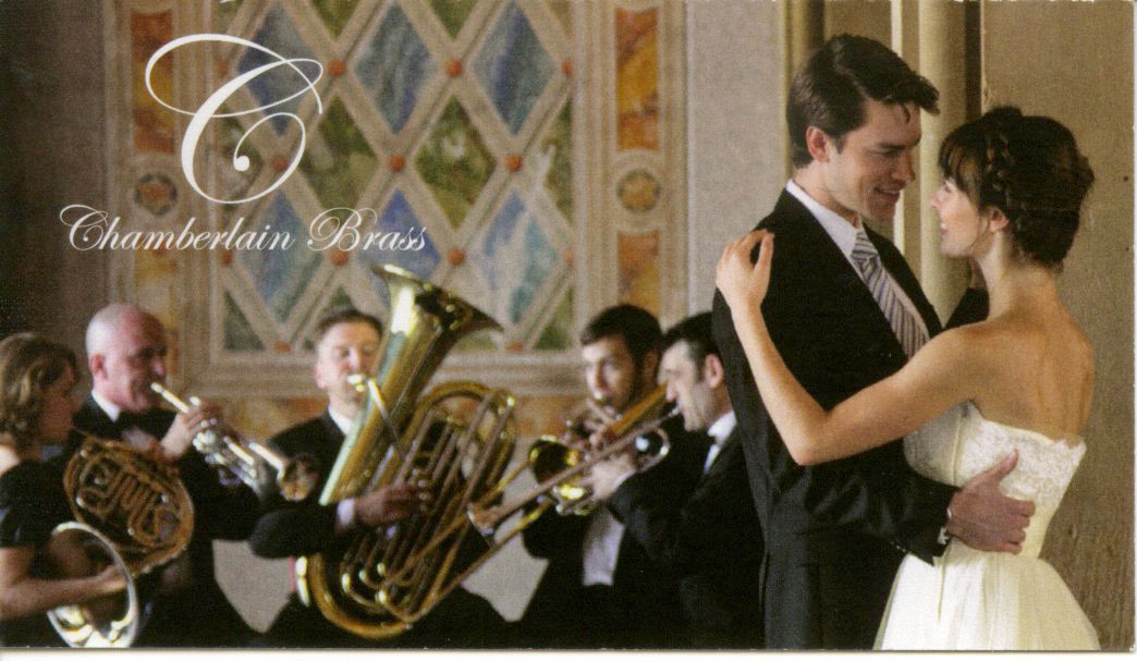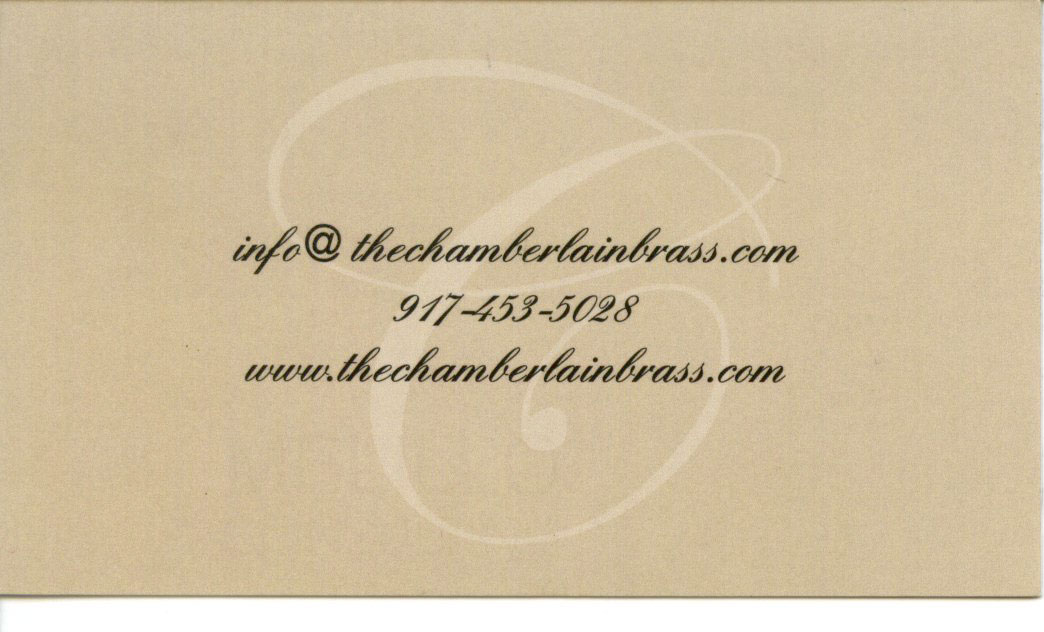 Would like my card to have title "Chamberlain Brass", subtitle "concerts - weddings - parties". Also need email address info@thechamberlainbrass.com, website url www.thechamberlainbrass.com, phone number 917-453-5028. My current script font, and logo, is Edwardian.