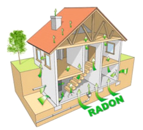I need an image designed that shows a home (house) with gas entering the house from the soil below it. The gas that is entering is known as "RADON" so please illustrate the phrase "GOT RADON?" into the image somewhere near the gas entry areas (below the house.) The image can be originated from either a drawing or photograph.