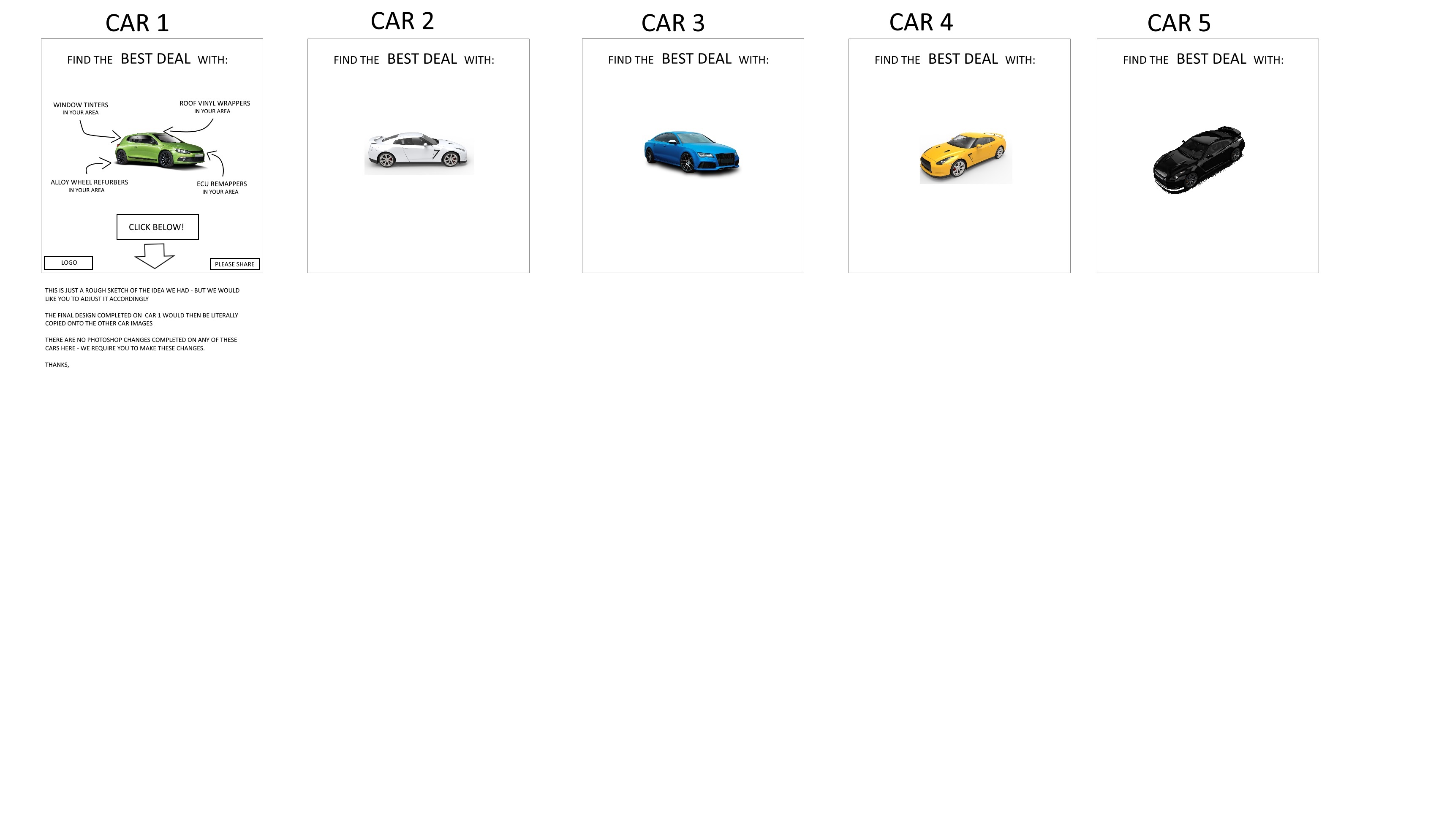 Main title across the top will read ‘FIND THE BEST DEAL WITH :’ - The words best deal should stand out more and be of a larger font / potentially different colour, maybe orange to keep in theme with the website. Then as shown in the sketch, we will have car number 1 which has been photoshopped as stated further down . Then we will have arrows pointing onto the car which will state the different modifications that has been completed on the car e.g - arrow will point to the rear window and will state the words :