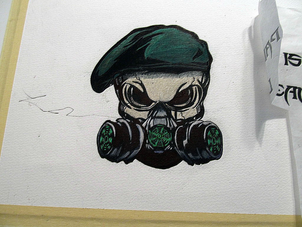 i am looking to have radioactive biohazard and apocalyptic elements in this design accents with gasmask skull as the central element. i am a huge fan of tattoo inspired artwork and logos. this logo needs to look sort of para-military, para-law enforcement and i would love to see if we could integrate design elements to represent the spinning element if that is possible.
