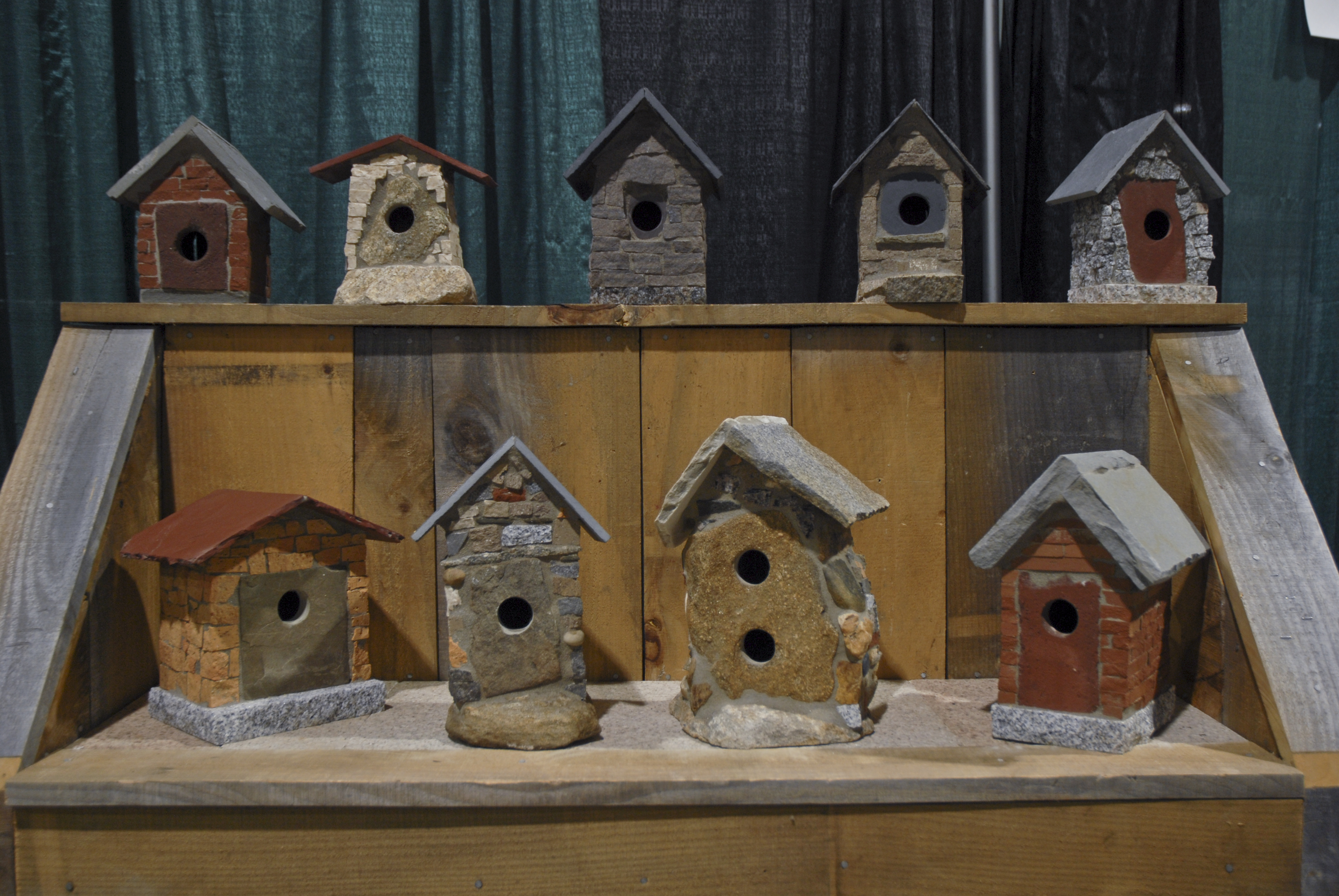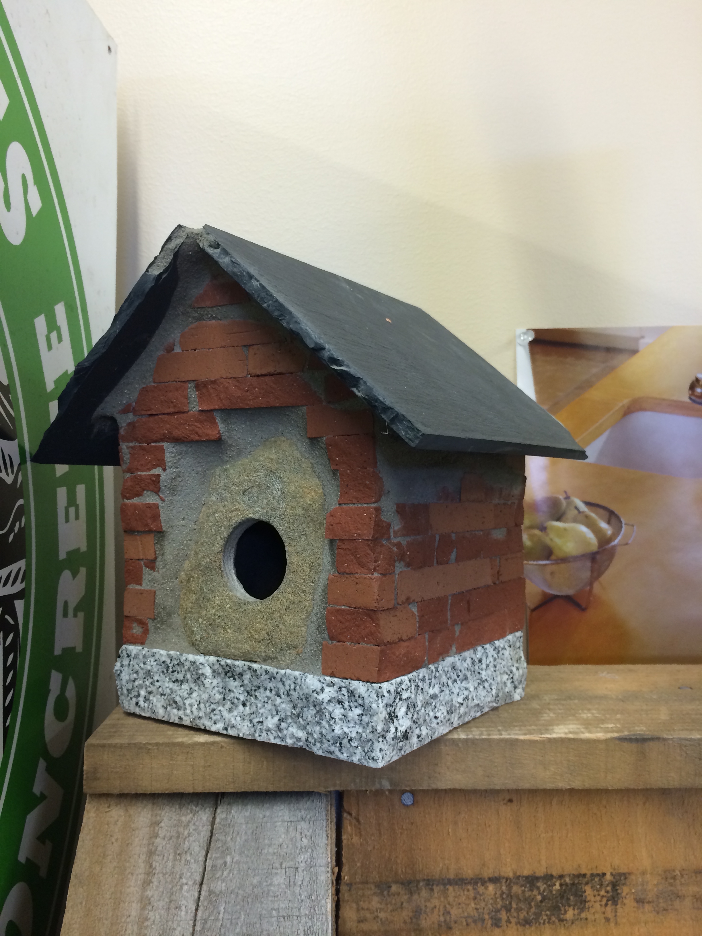 - image of a birdhouse. rock or stone or brick somehow incorporated.