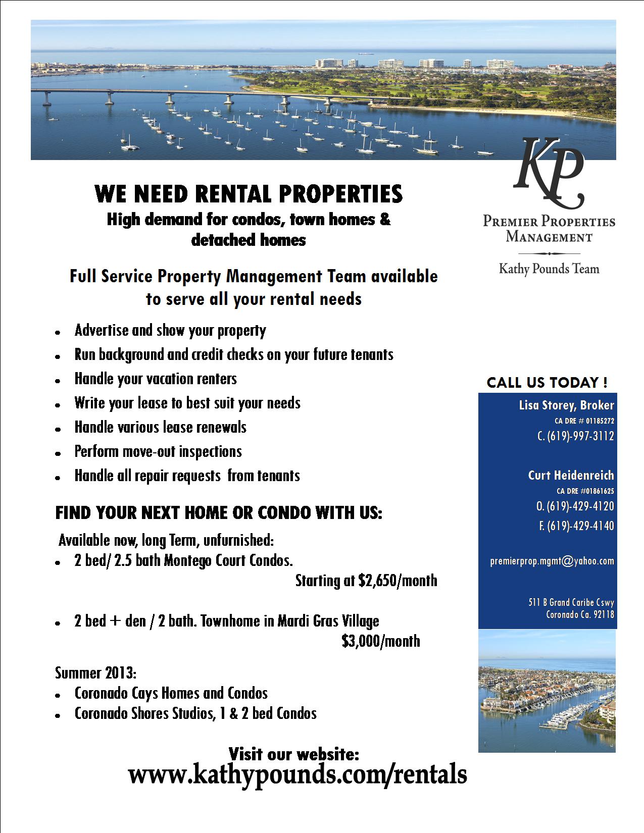 We are a real estate, property management company in southern California. We work with luxury properties along the coast. San Diego, Coronado and Imperial Beach. We are looking for a new logo for real estate signs, business cards and other print materials to grow our business. We would like to incorporate a coastal theme if possible but not necessary. Logo must be easy to read from a distance and easy to identify from other business. We want to stand out but stay professional.