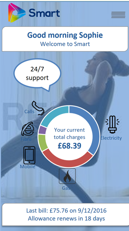 We need a App Homepage design with a UI similar to the attached mock up on an iPhone 7. The app is intended to put customers in control of their usage and spend on their fixed phone, broadband, mobile, gas and electricity.
