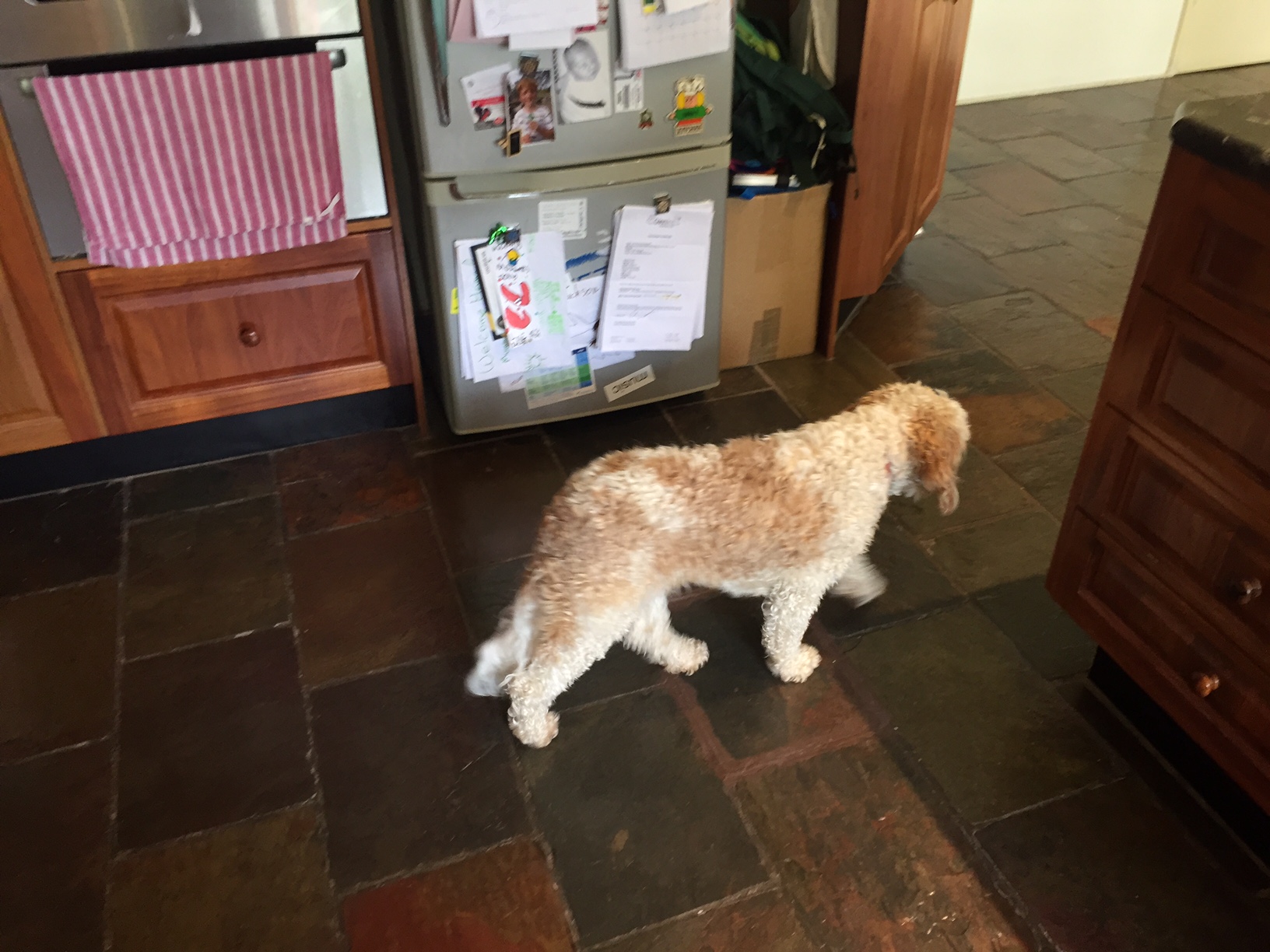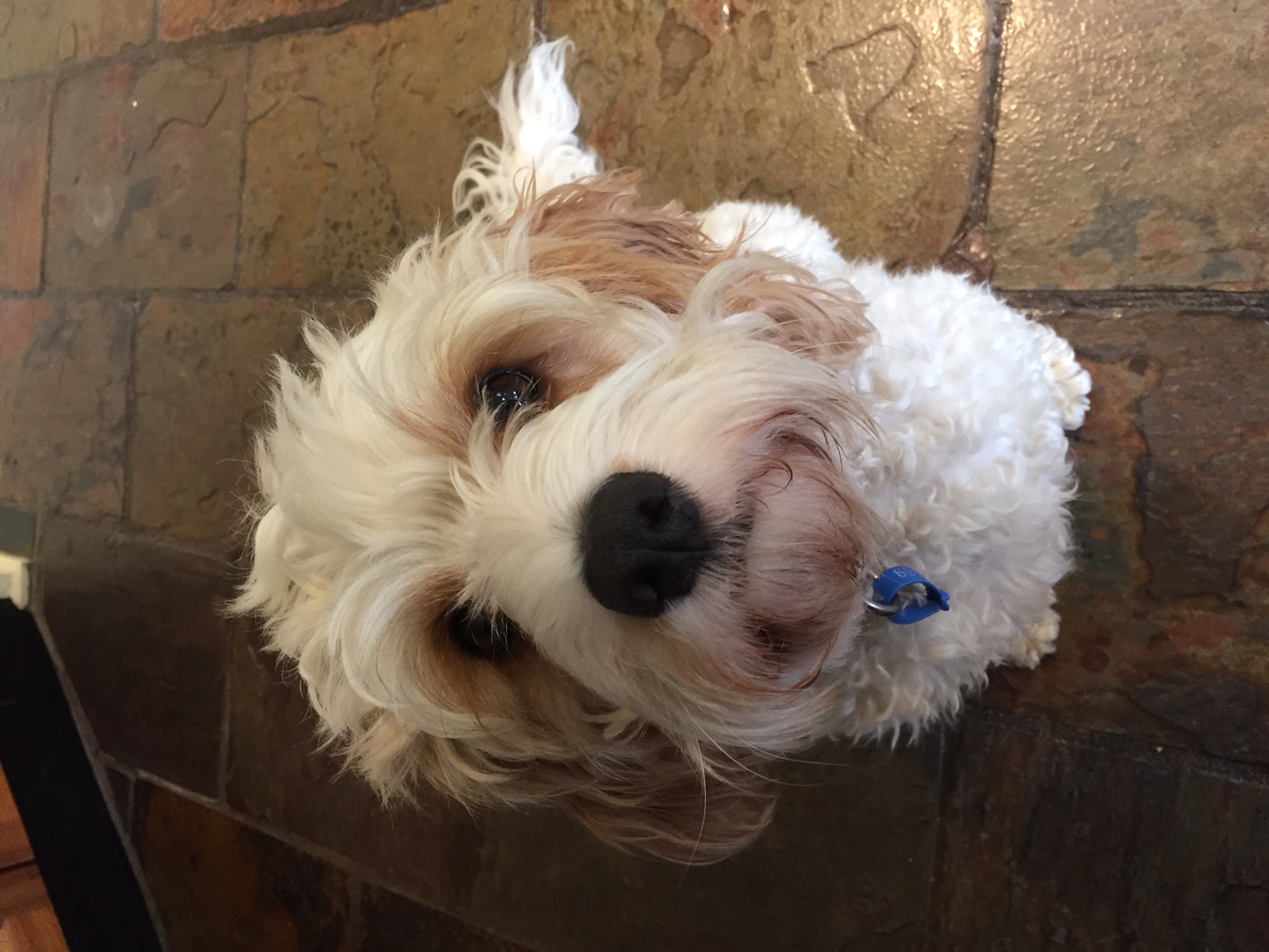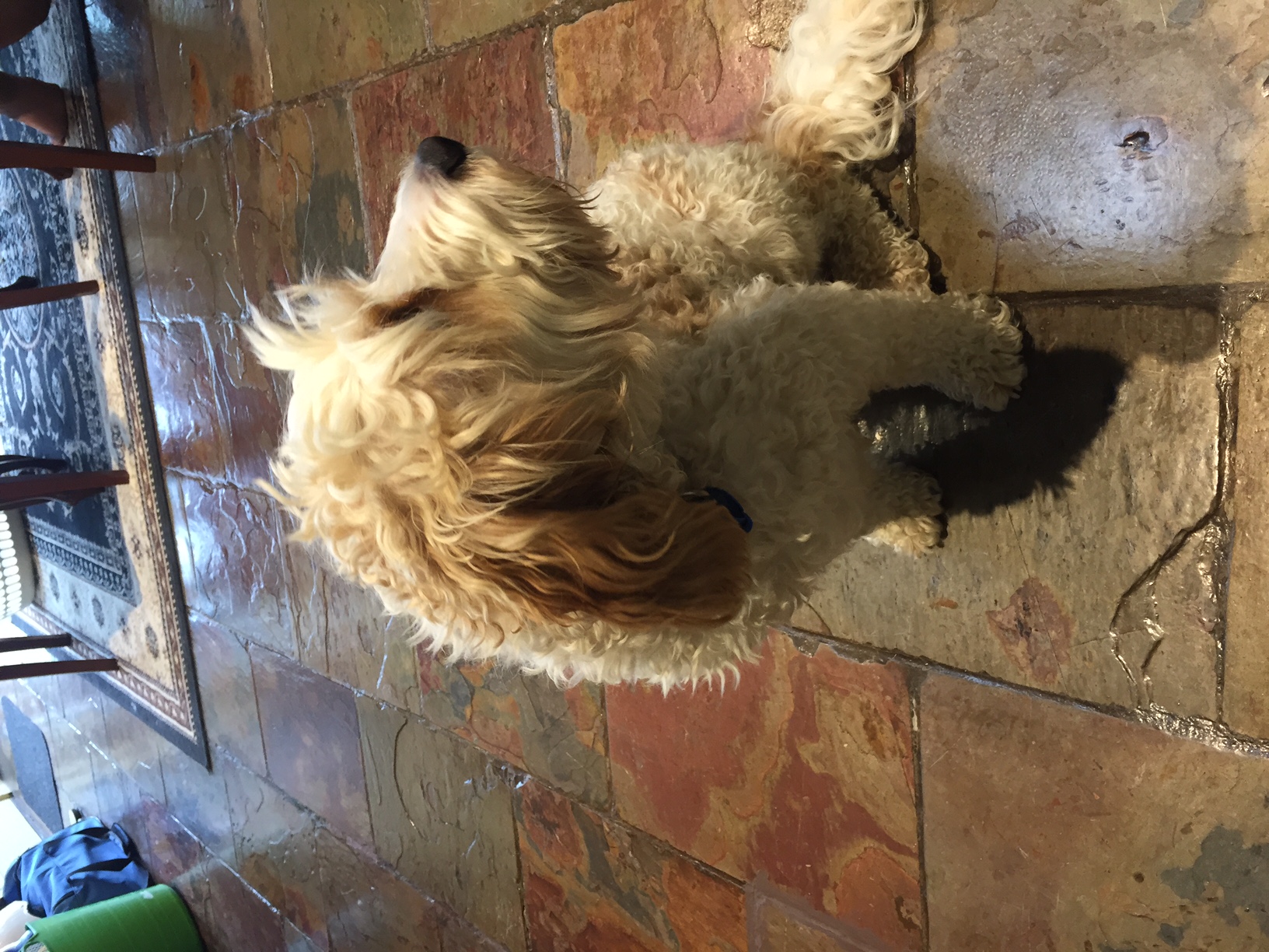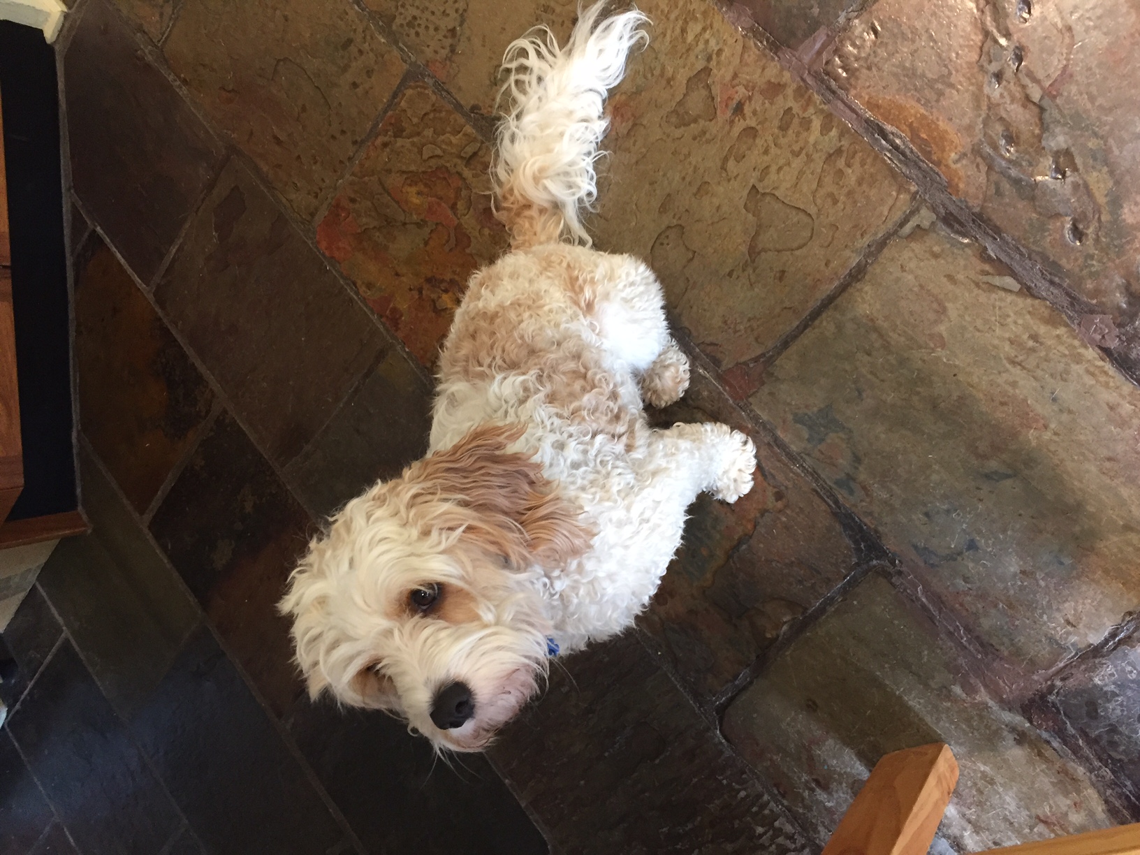 The dog is a white and tan/orange cavoodle. In our pictures it looks like her fur is curly, but we want her hair in the image to look smoother.
