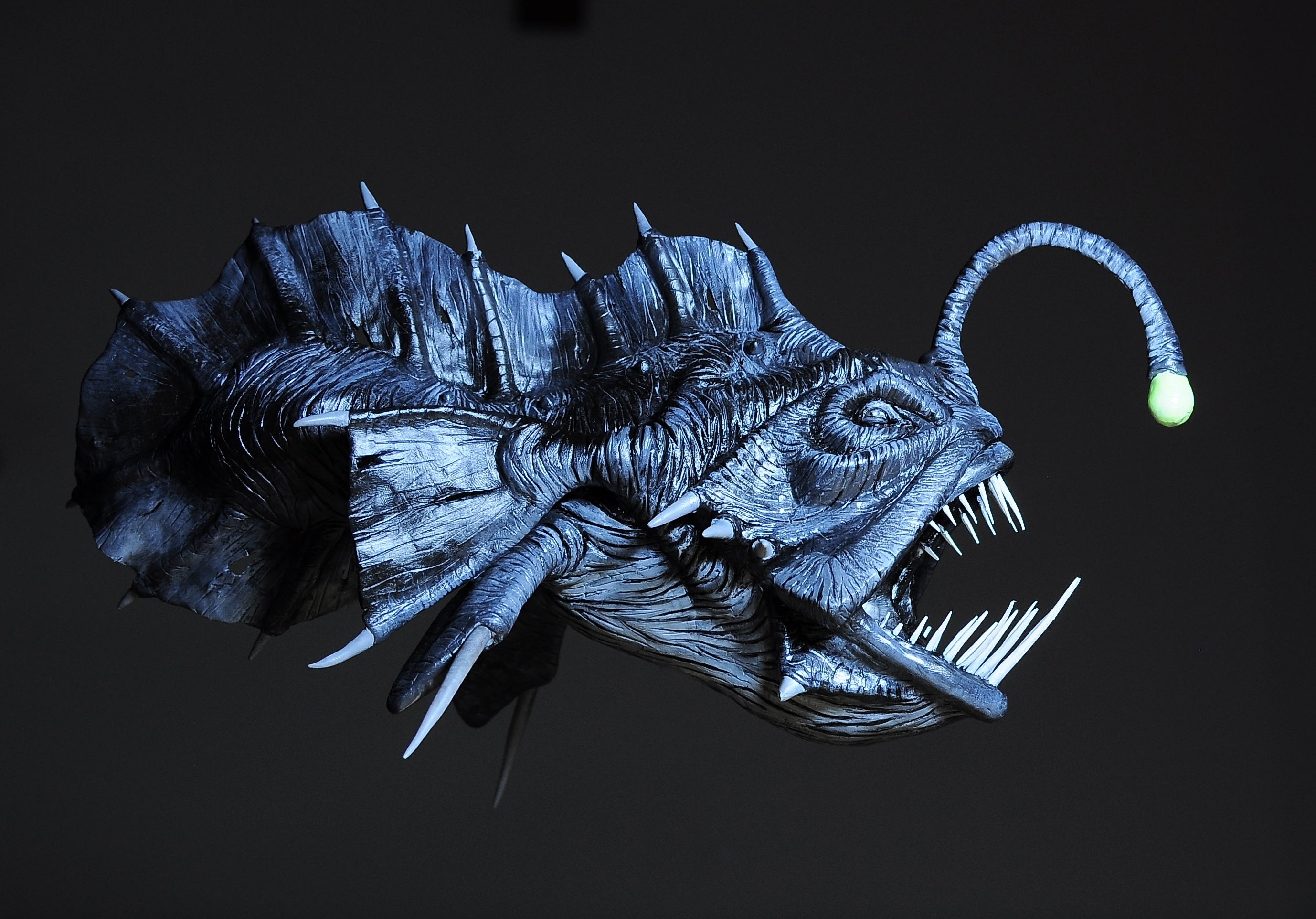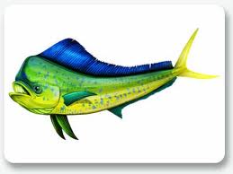 I am looking for a dolphin fish (mahi mahi) with a "mean" teeth/face. Basically a "monster fish" scary teeth/face and normal body. So dolphin fish body with a scary toothy face. On the back ."Keller Aquatics" on the top "Big Game Pole Spears" on the bottom. Please look at the attached pics for ideas.