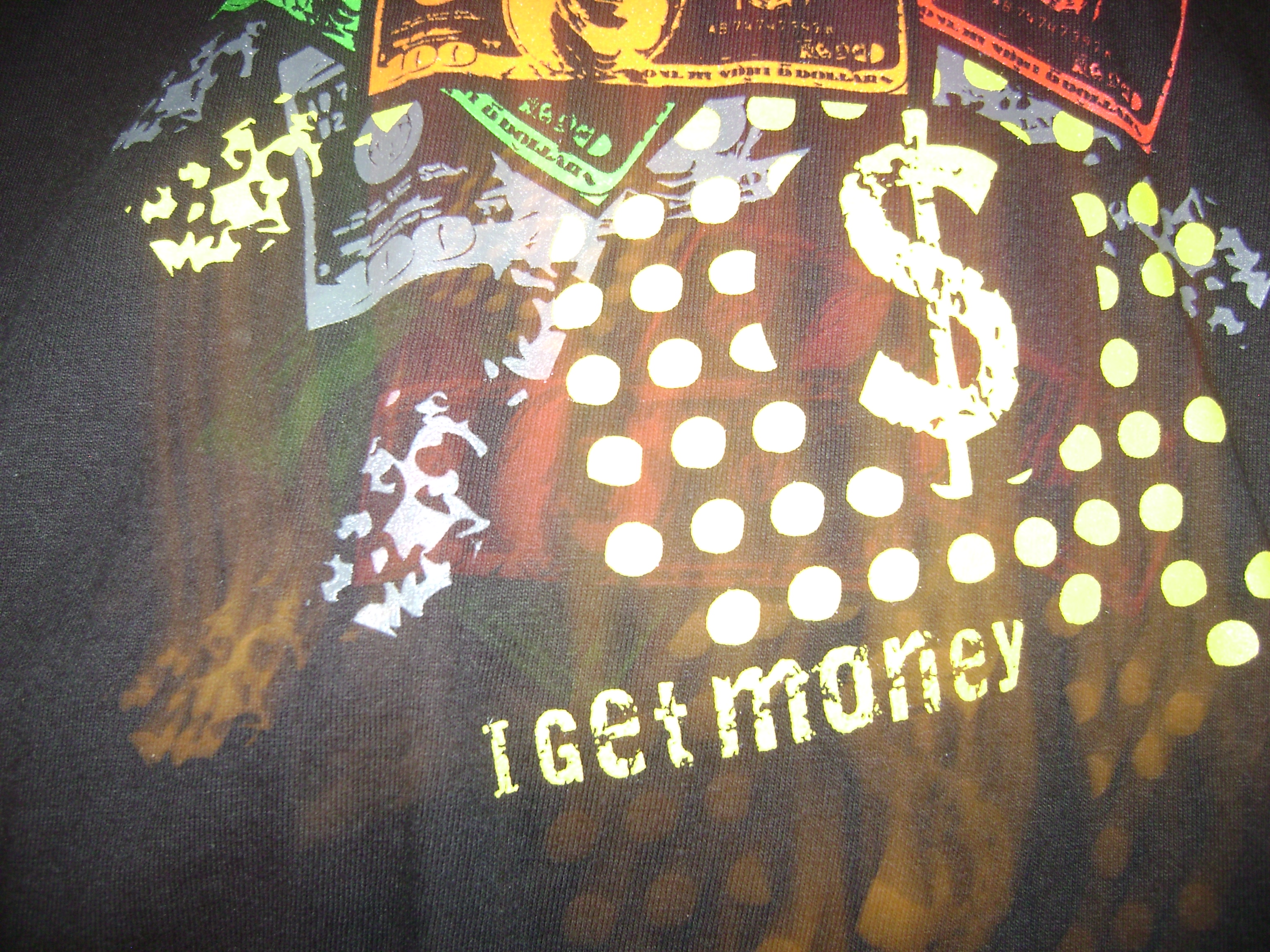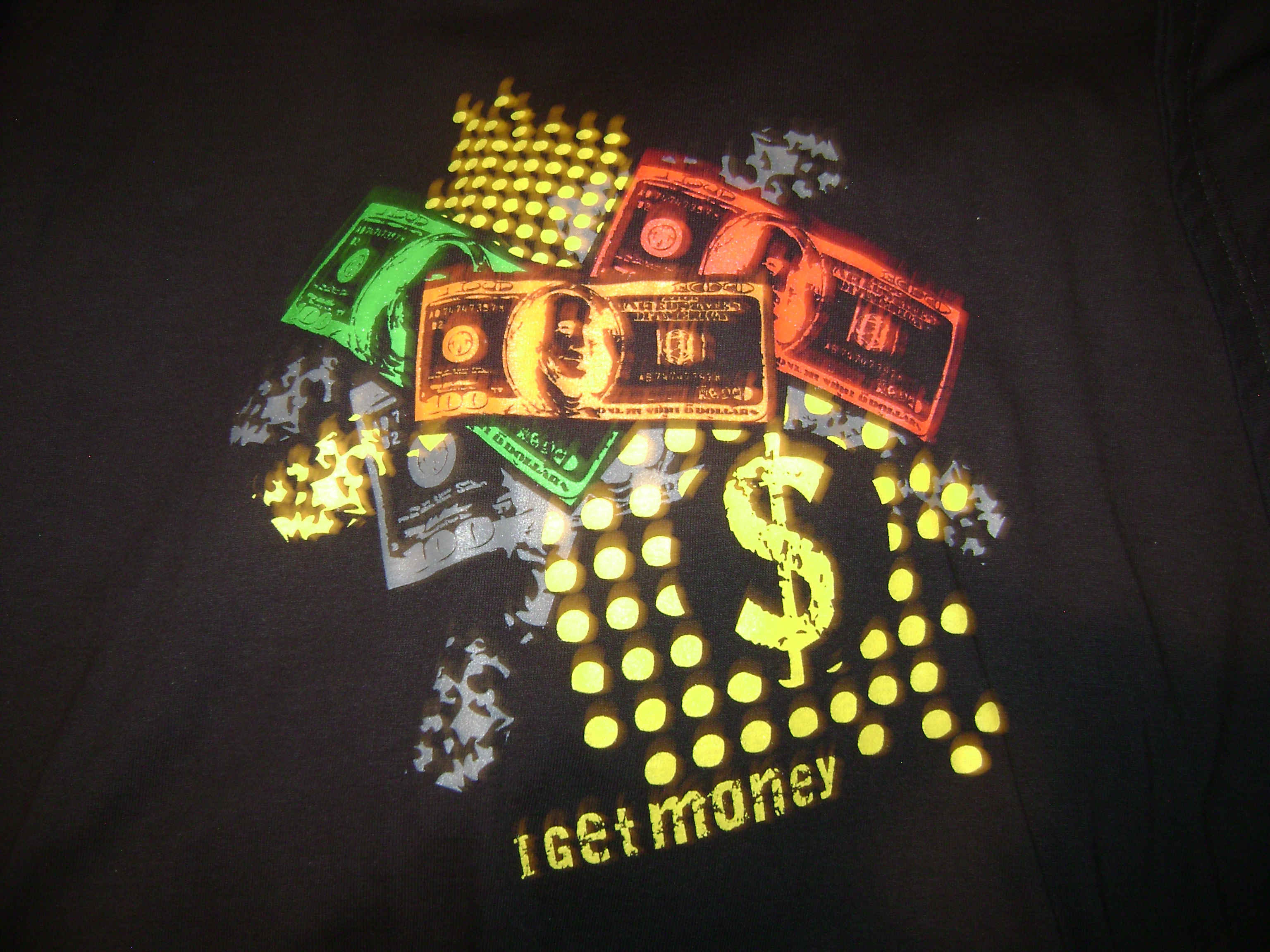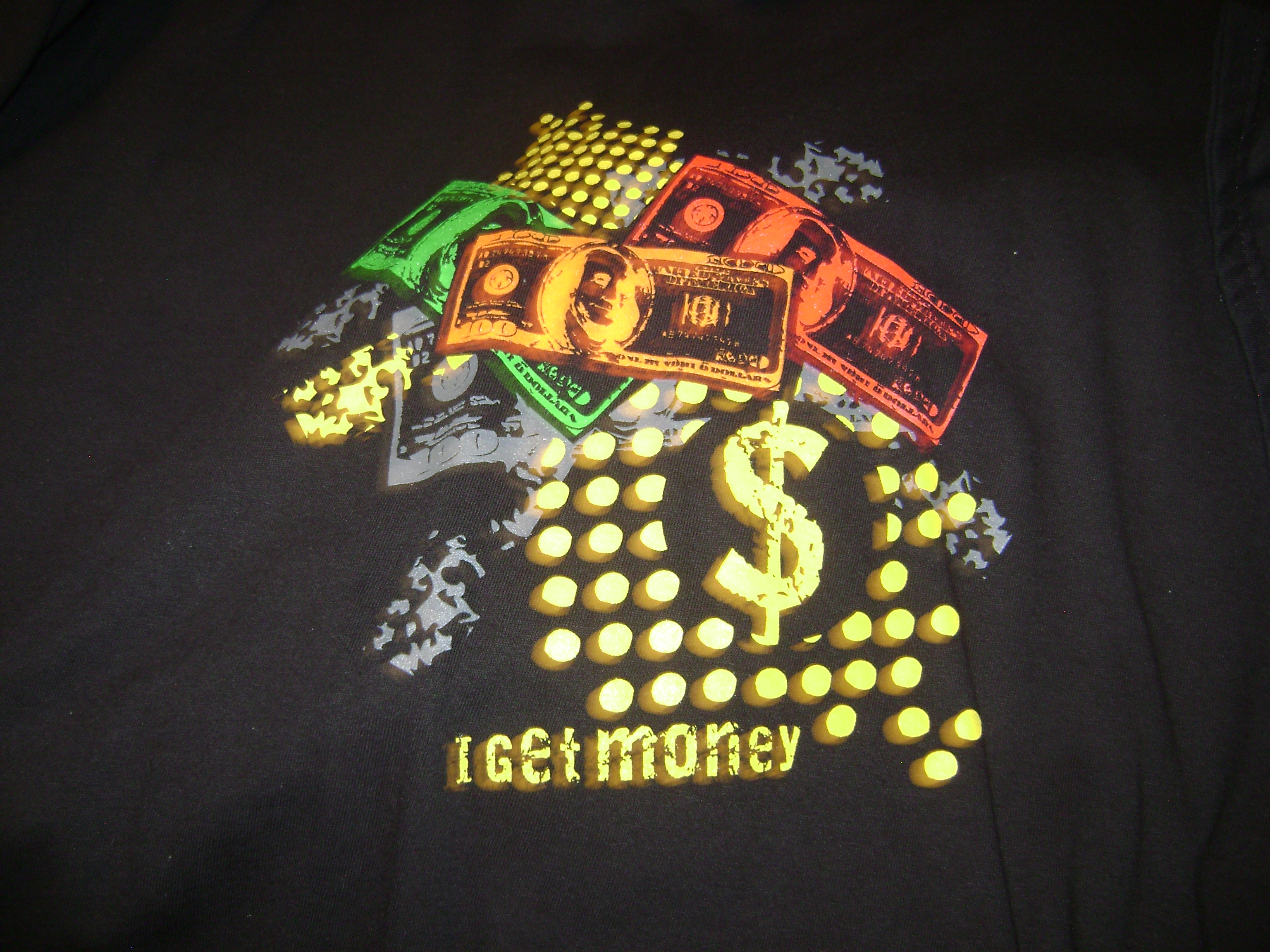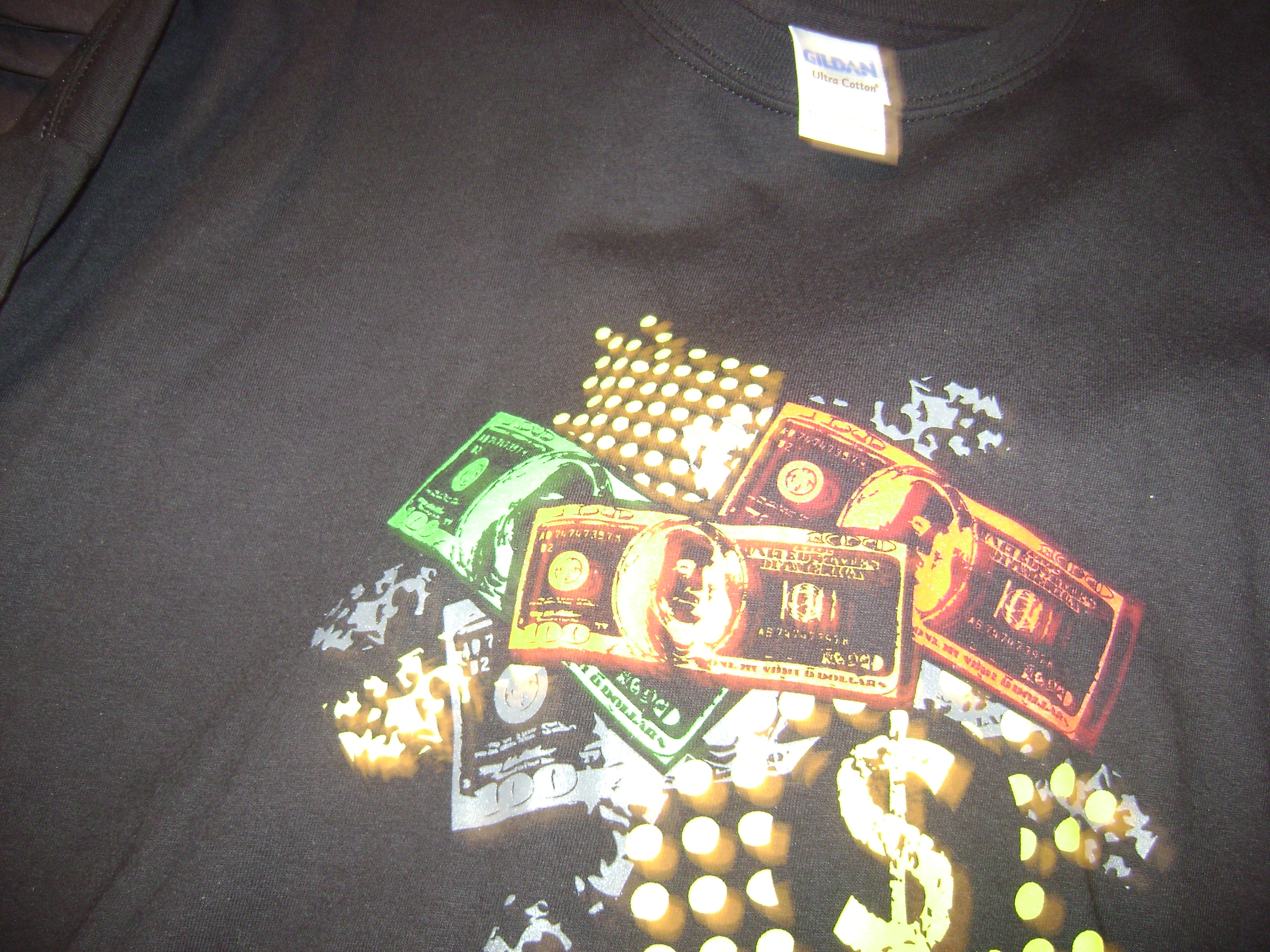 The text will be the main focus of the image. The background will be different color united states bills to give the design a less plain look something like the attached design.