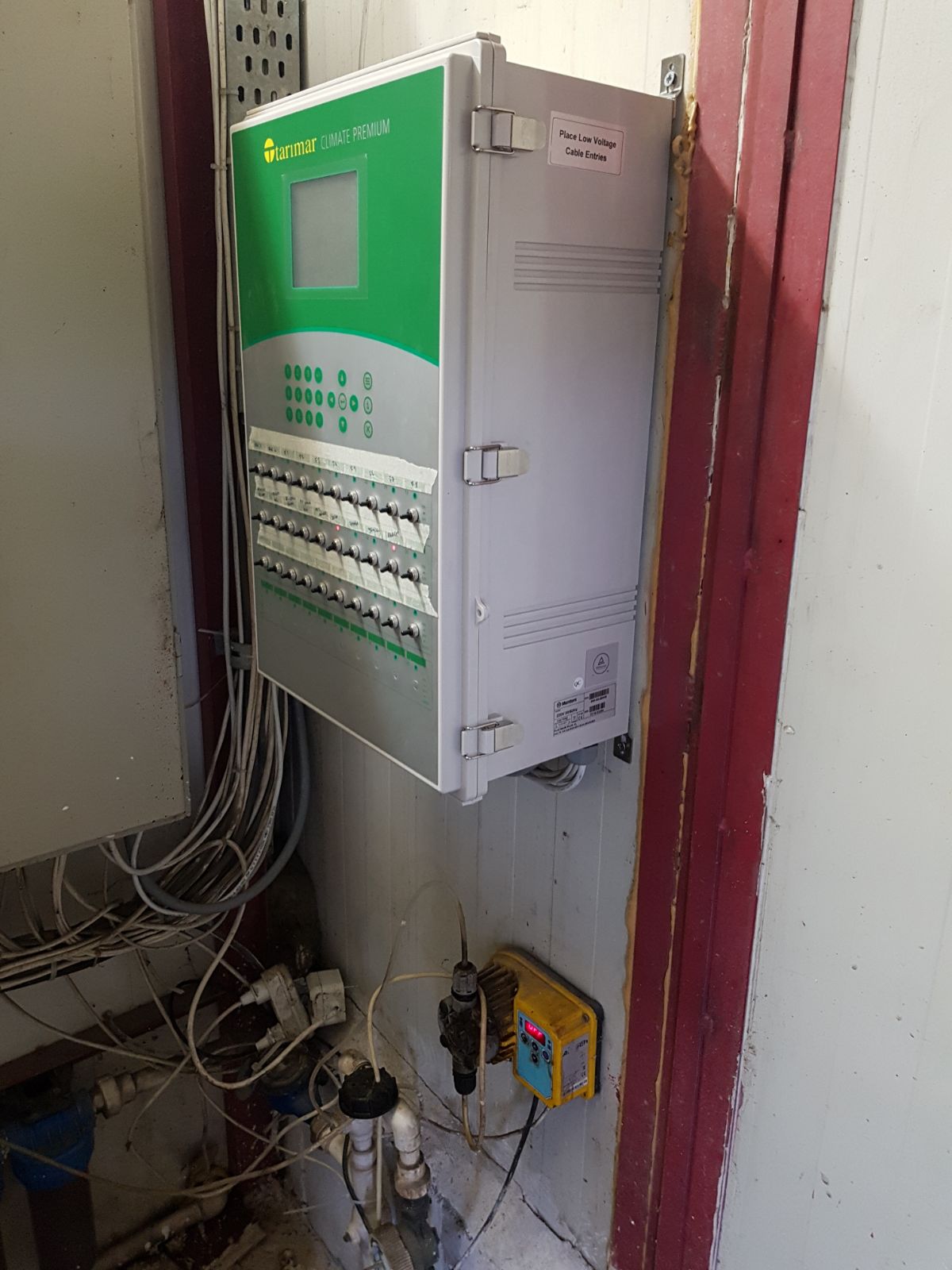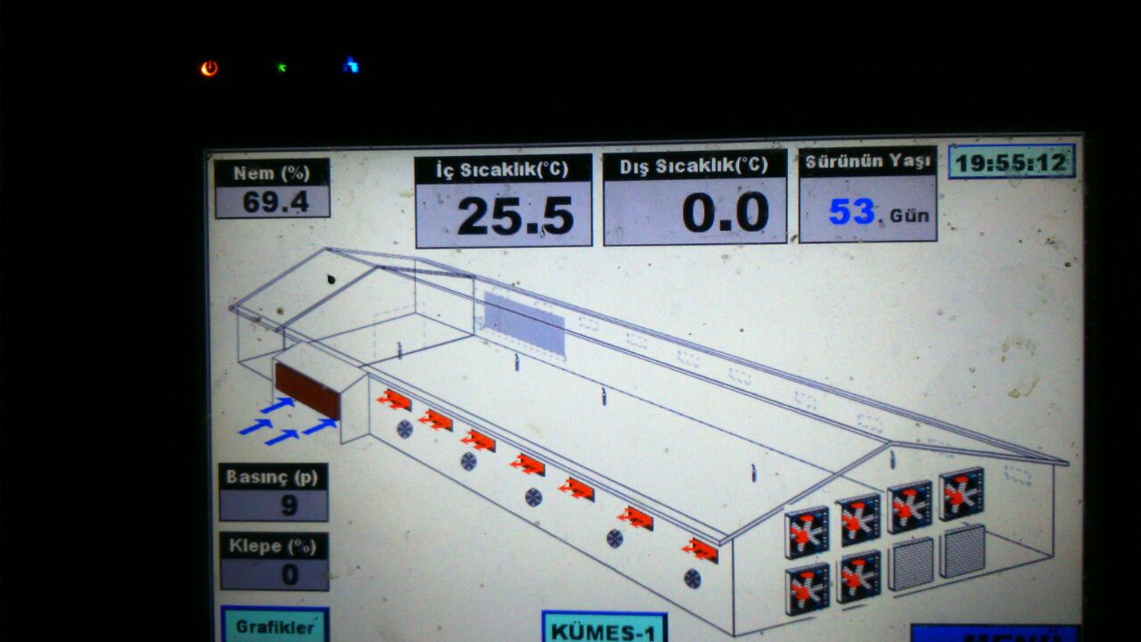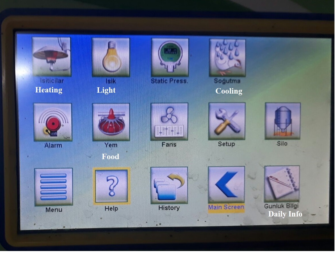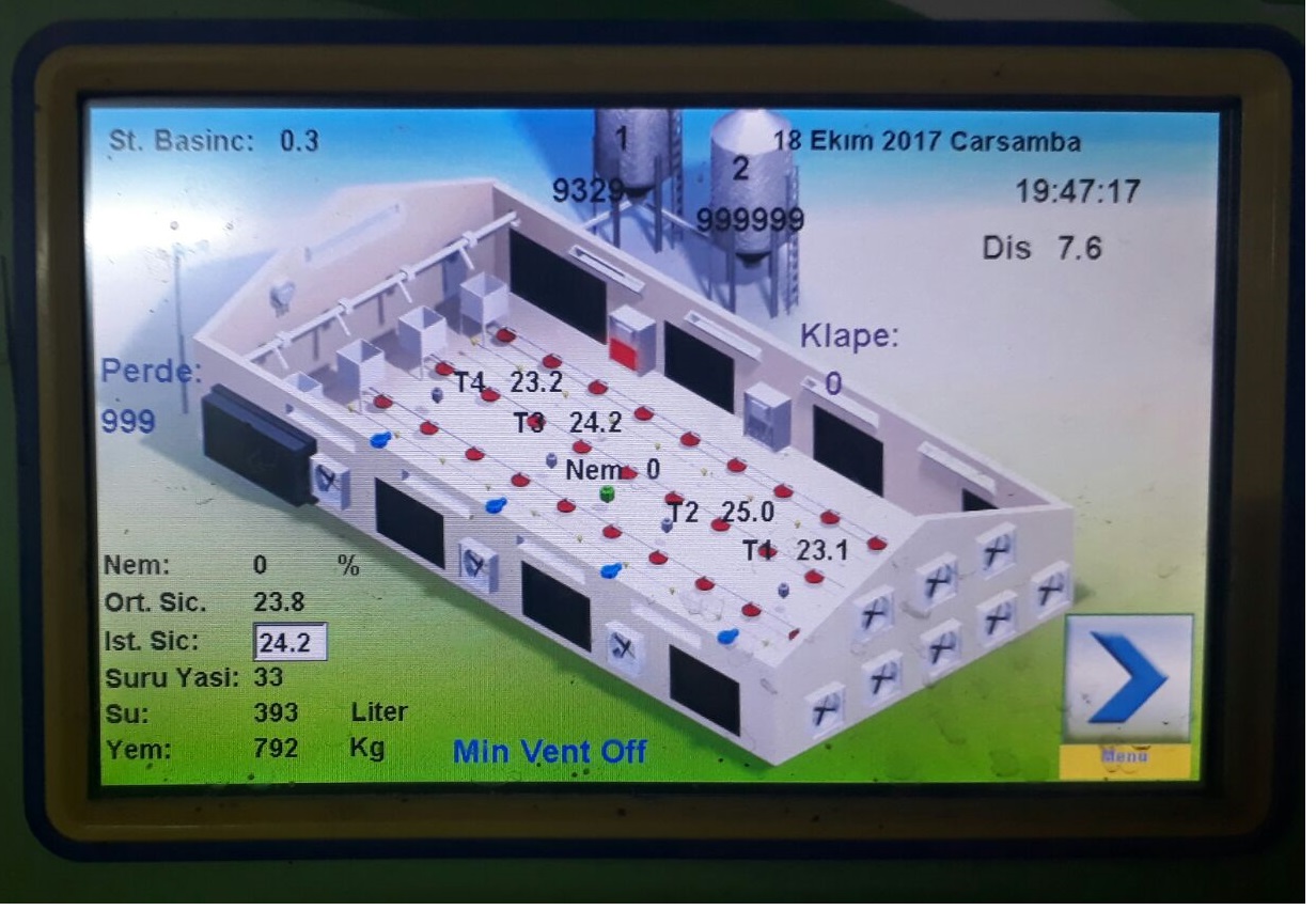 4- LED Screen Main Page Menu : This menu has a poultry house drawing with summary information boxes above.