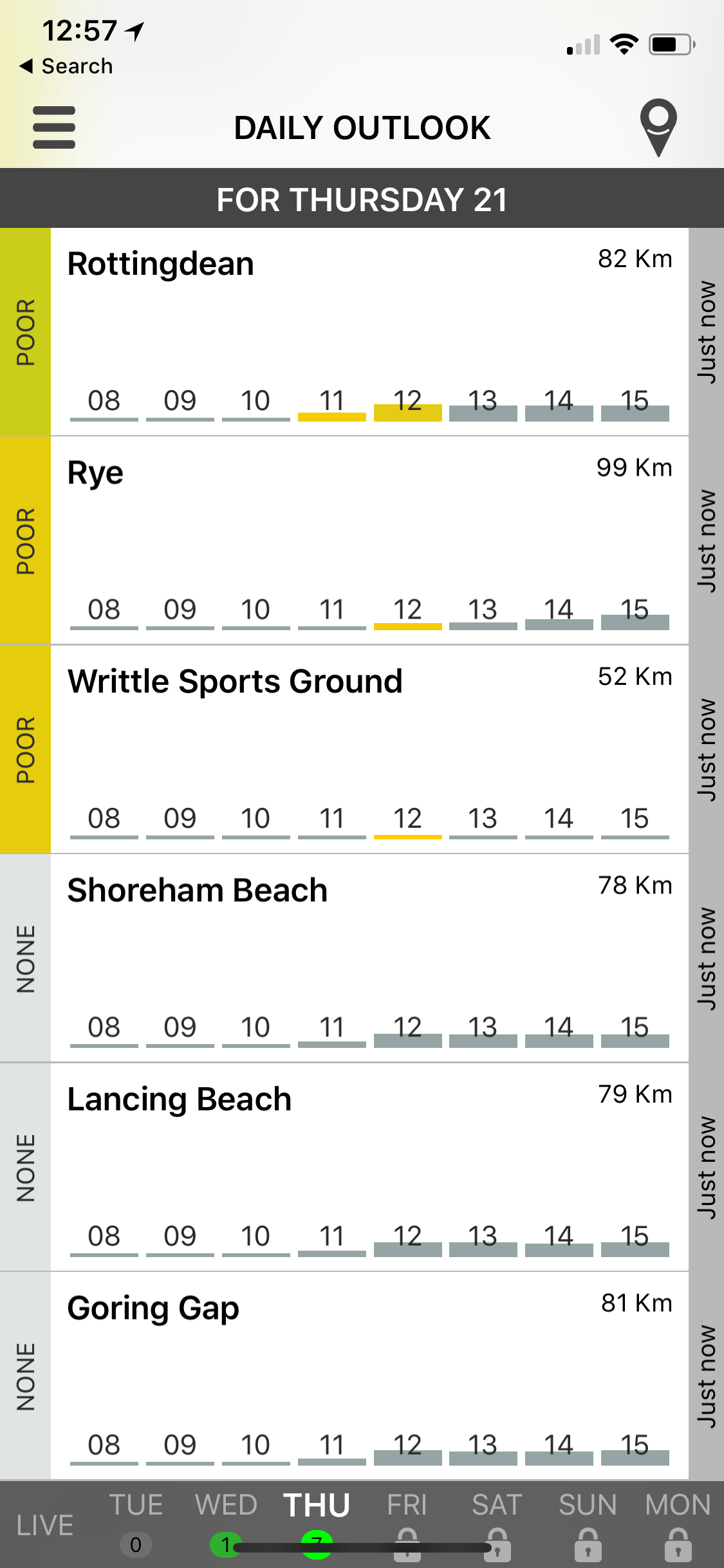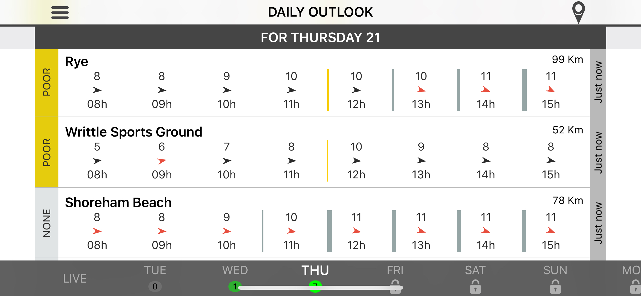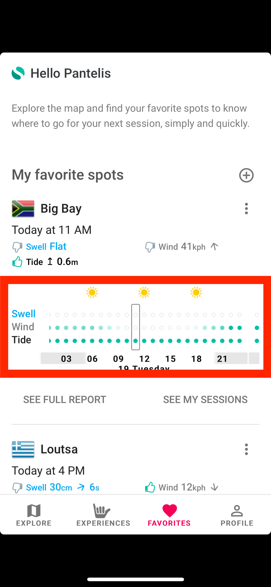 The user has a list of favorite spots that he is monitoring. Then he selects the date that he wants to get the forecast. The forecast screen presents a list of all the spots and a summary of the weather conditions. Spots are sorted by weather conditions. At the top, he gets the spot with the best weather conditions. We have an algorithm that can evaluate whether given weather conditions are good or not. When they are good we indicate that to the user.