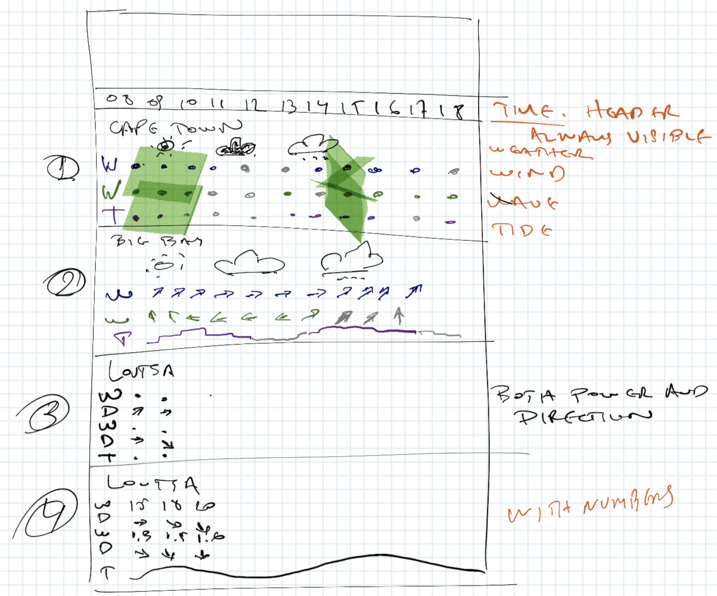 We are redesigning our application, KiteSpotter. Our main screen is the forecast screen. The forecast screen presents the forecast for multiple places for the selected day.
