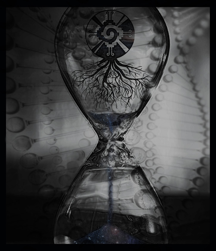 - All the elements in the images I submitted. There are stars and cosmic type imagery as sand in the hourglass as well as the DNA strands in the background. The Hunab Ku mayan symbol in the top of the hourglass and all the original elements present in the image I submitted.