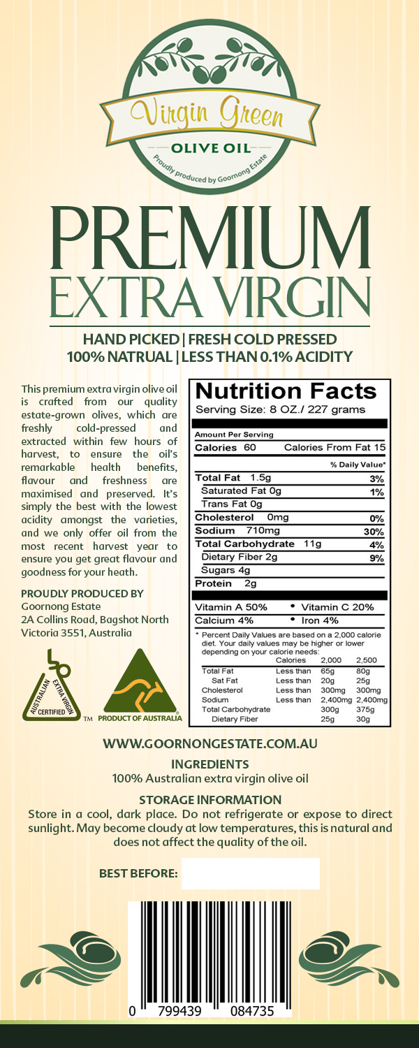 Packaging design for Virgin Green Premium Extra Virgin Olive Oil