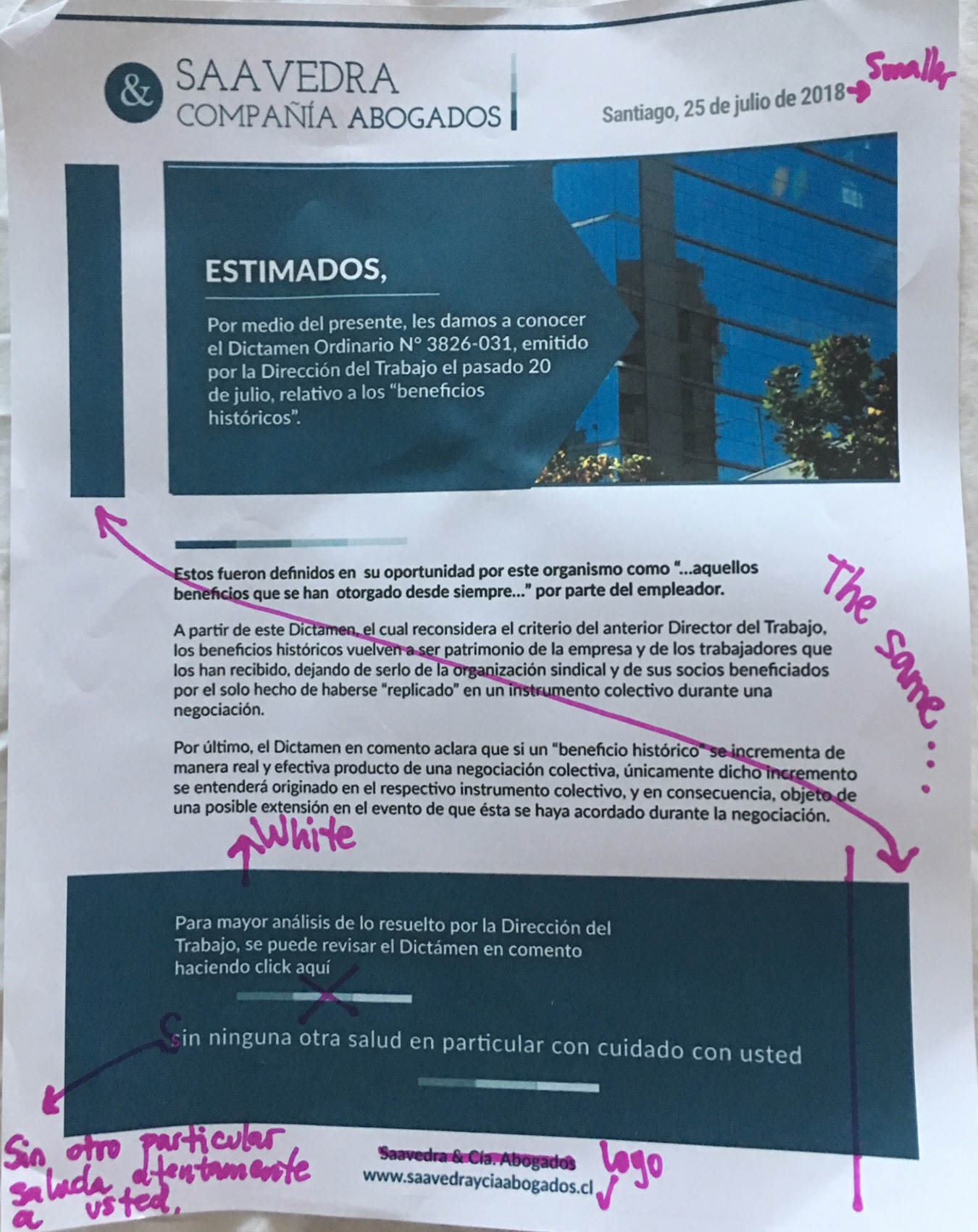 It'sa "News" for their clients. Attached you can find the current News without design. It must be elegant but very attractive and modern. Their web site is http://www.saavedrayciaabogados.cl/ Their expertise is labor and employment practice area. It must be in editable format so that lawyers can write the news in a template with this corporate design.