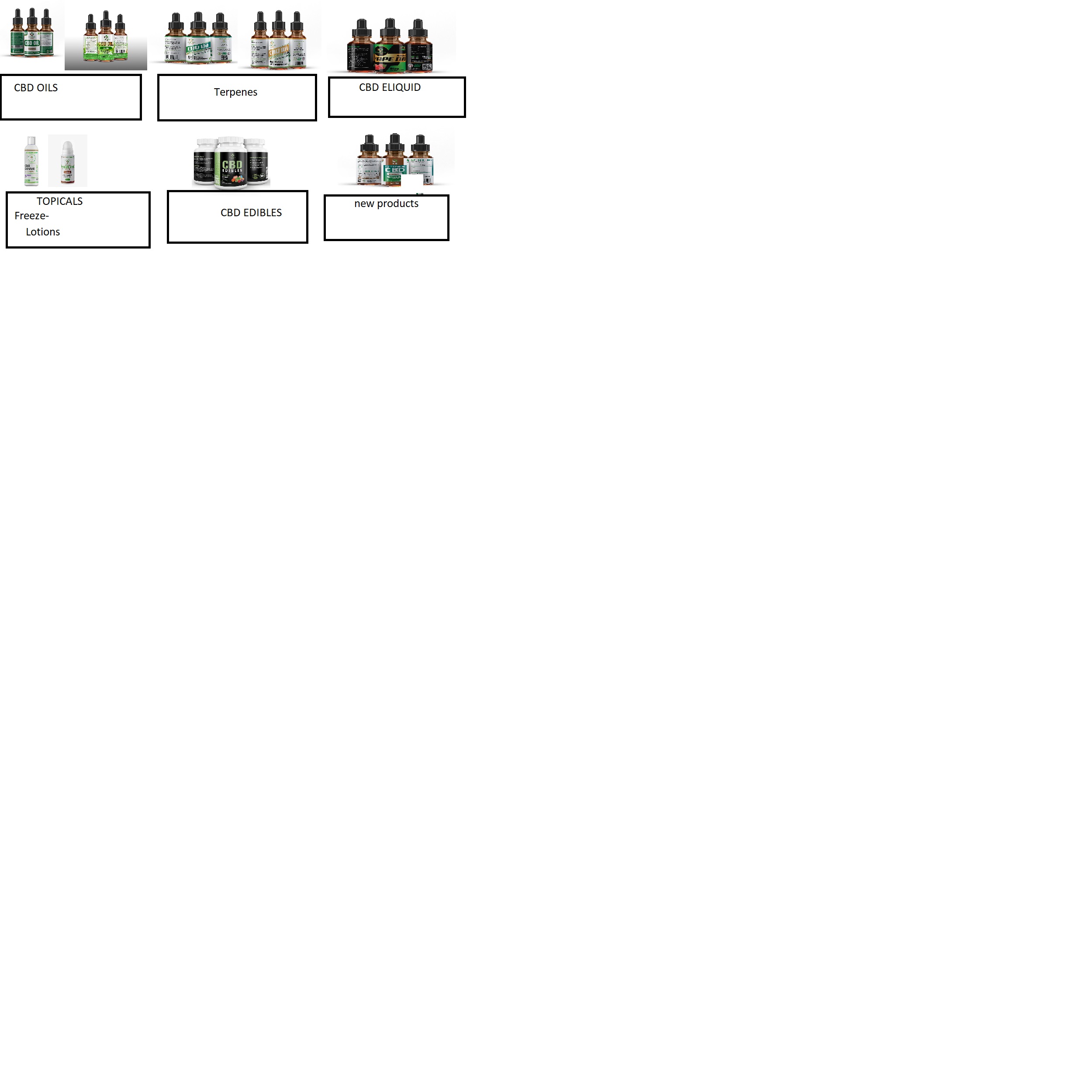 - Products listed- CBD OILS, CBD EDIBLES,TERPENES, CBD TOPICALS, CBD E-LIQUID,NEW PRODUCTS