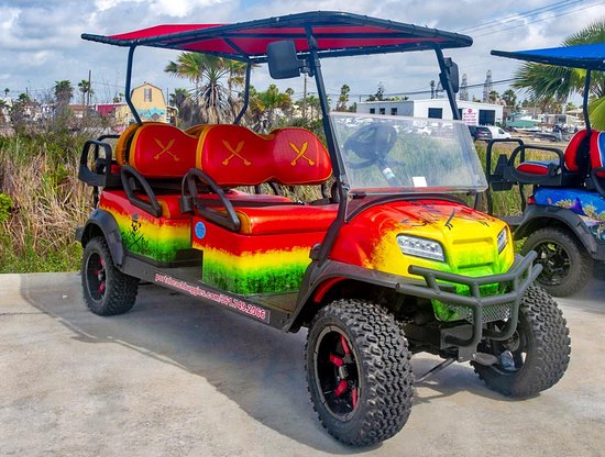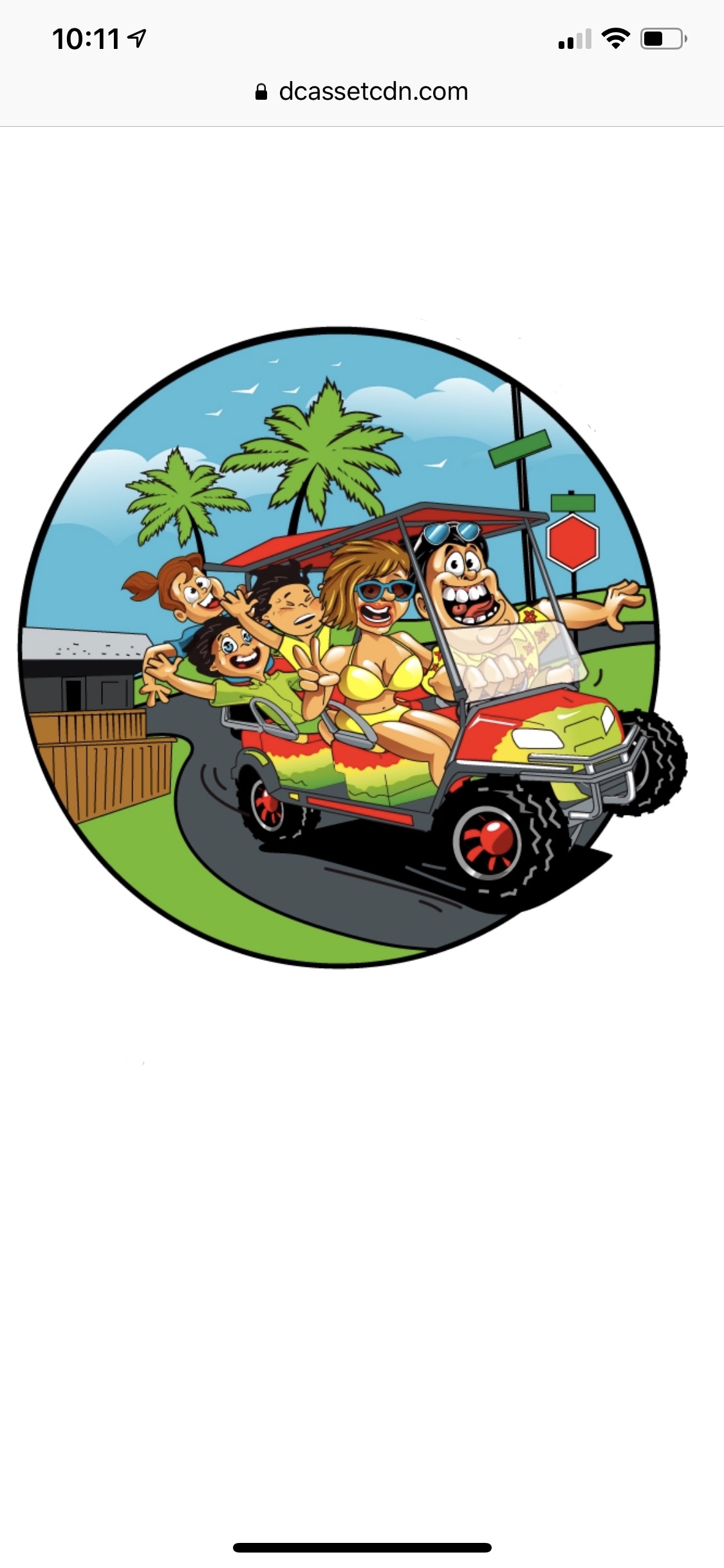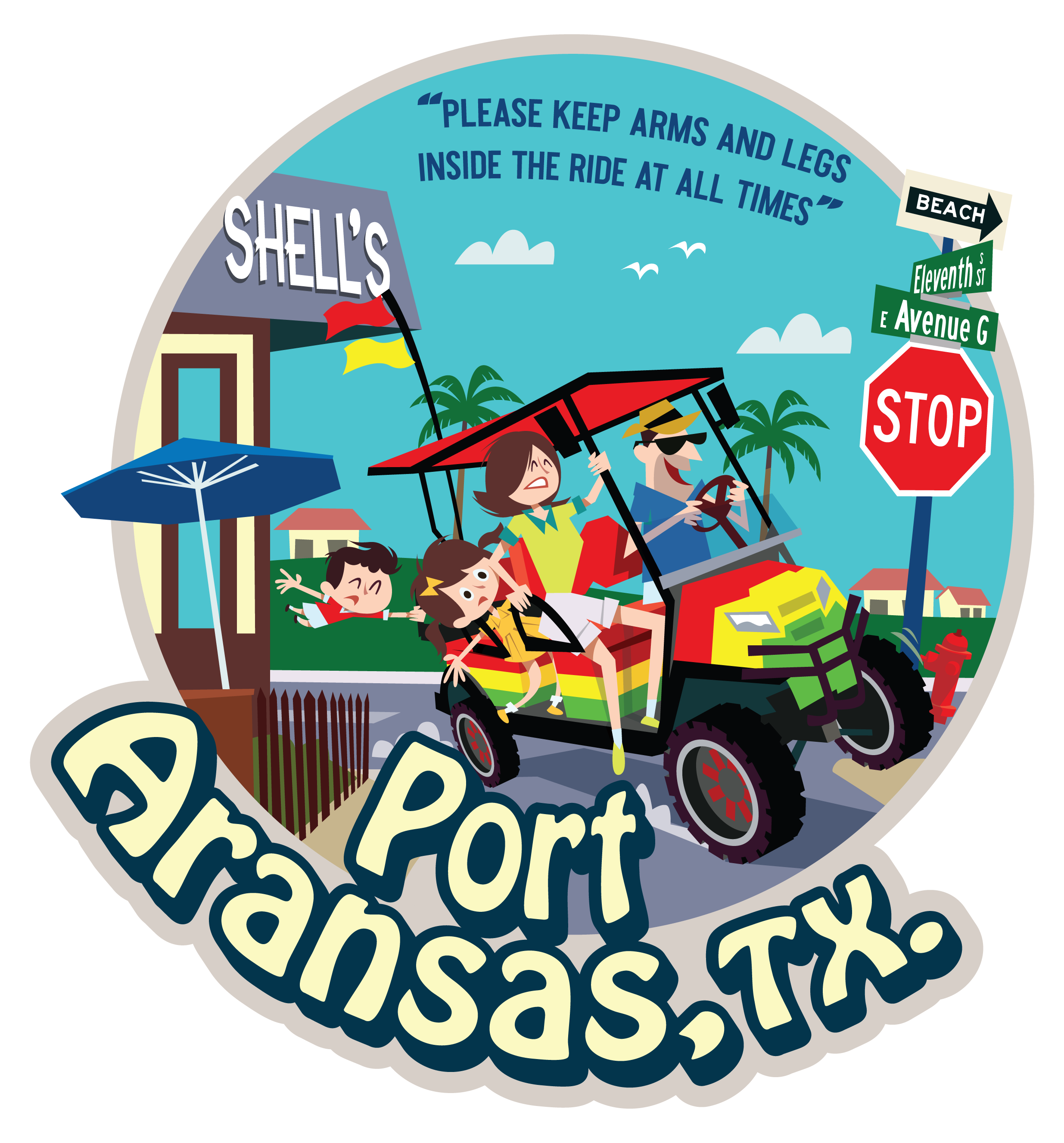 Artist to design a male caricature (dad) with family in a 6 seater golf cart. Mom, and 3 children. The golf cart should be speeding around the corner and on 2 wheels. The children should be as if they are about to fly out, or hanging on for dear life. The designer should recreate the elements in the photos attached. The shells store, the street corner stop sign and road signs, as well as the beach sign should all be in the background, but the focus point should be the crazy dad with his family speeding around the corner. Pictures of golf carts attached, as well as the background pictures to be recreated. This shirt is meant to be funny and cartoonish. I would like to develop characters to be used in similar designs about the crazy stuff dads do. Text on the shirt should read “Port Aransas, TX.” Design must be vibrant with colors that pop.