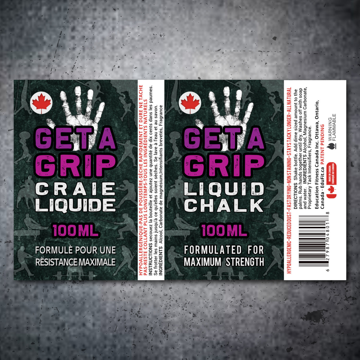 for logo front please remove 'formulated for max strength' on english and french. keep the maple leaf and move around 'GET A GRIP' to be more central over the chalk handprint.