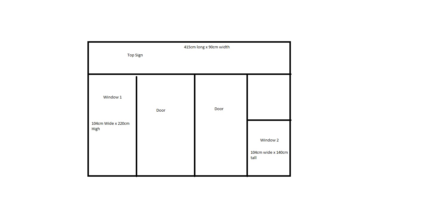I require a New shop sign for a retail store. with 2 x window design for printing onto diabond material. it must be bright and fresh. please see images of sizes required.