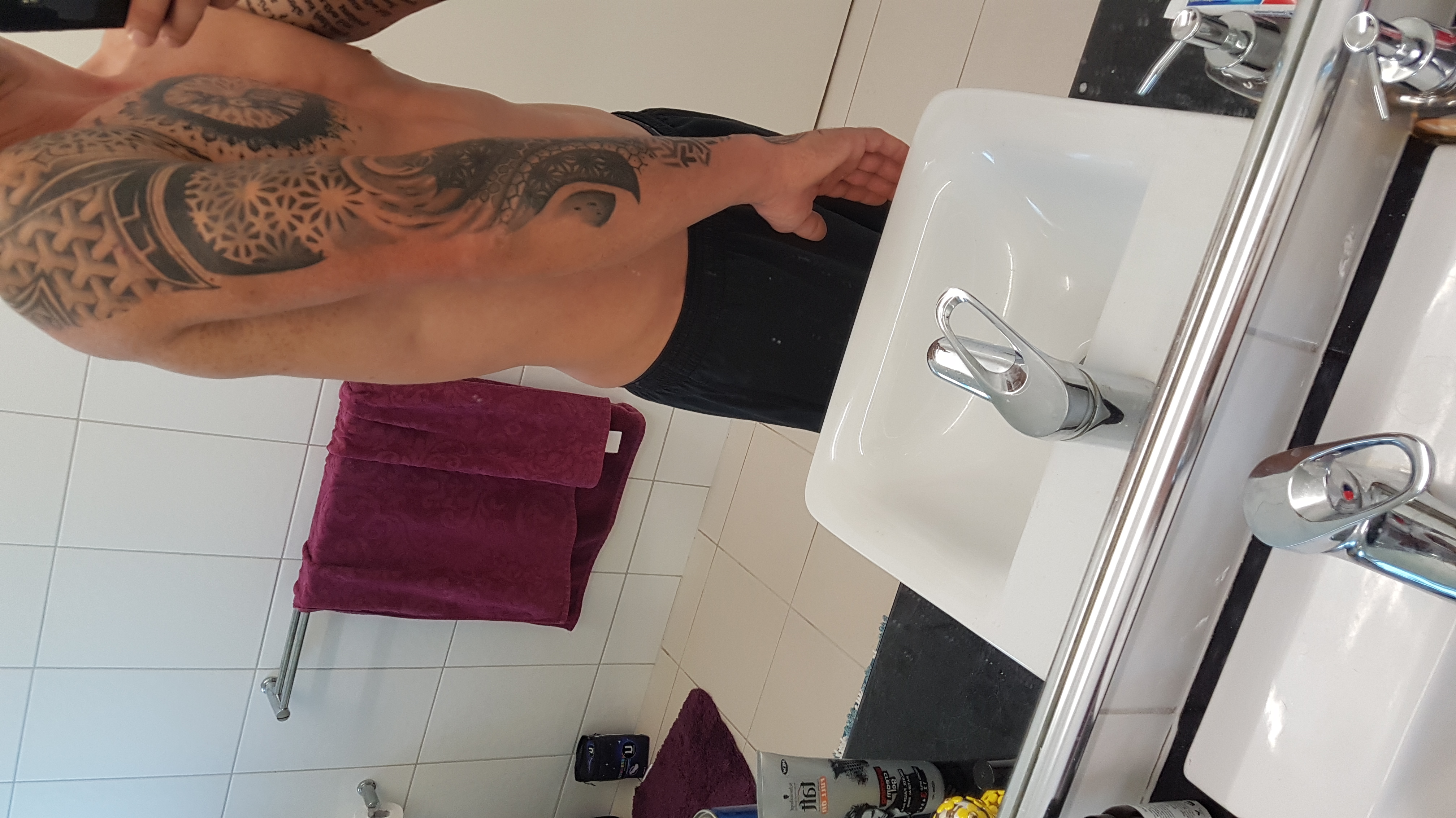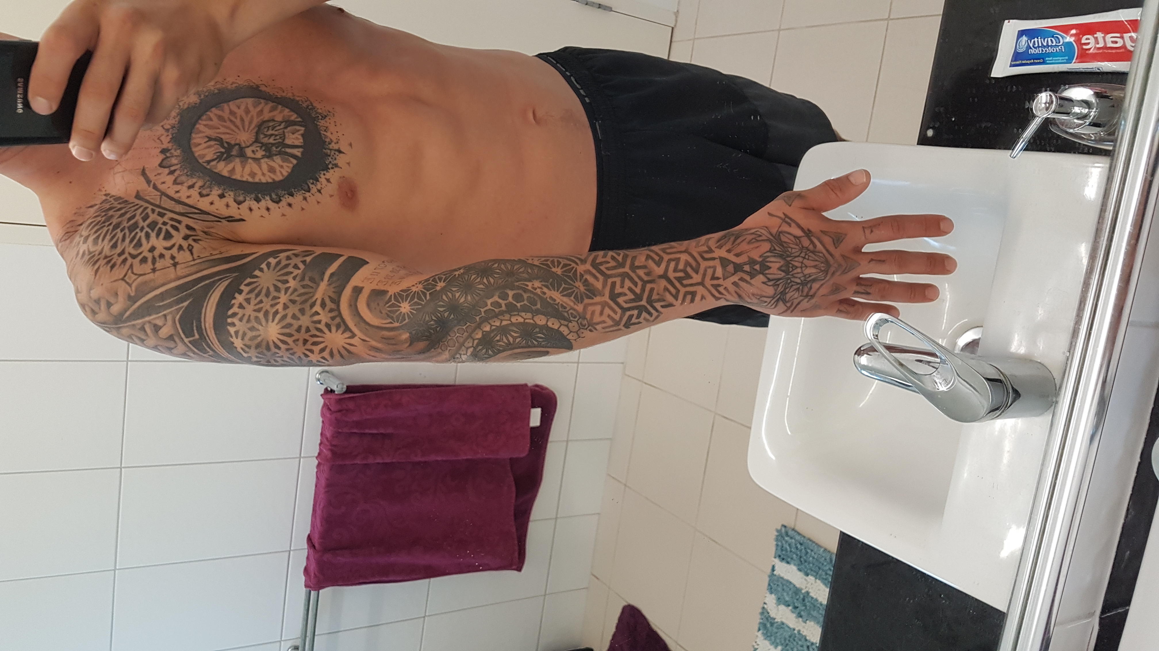 Hello. I currently have a geometric sleeve that I am not happy with and I am looking to make it better. It is the forearm that I would like to change mainly. There is quite a lot of solid ink, so im not sure what to do with it. I'm open to anything that looks good really. I like sharp lines, geometric patterns, bold shapes (especially triangles or arrows), so I'd like to stick to that kind of style, but again, I'll consider anything that looks good. Currently, only the top side of the arm is inked, but I would like to have the design cover the underside as well.
