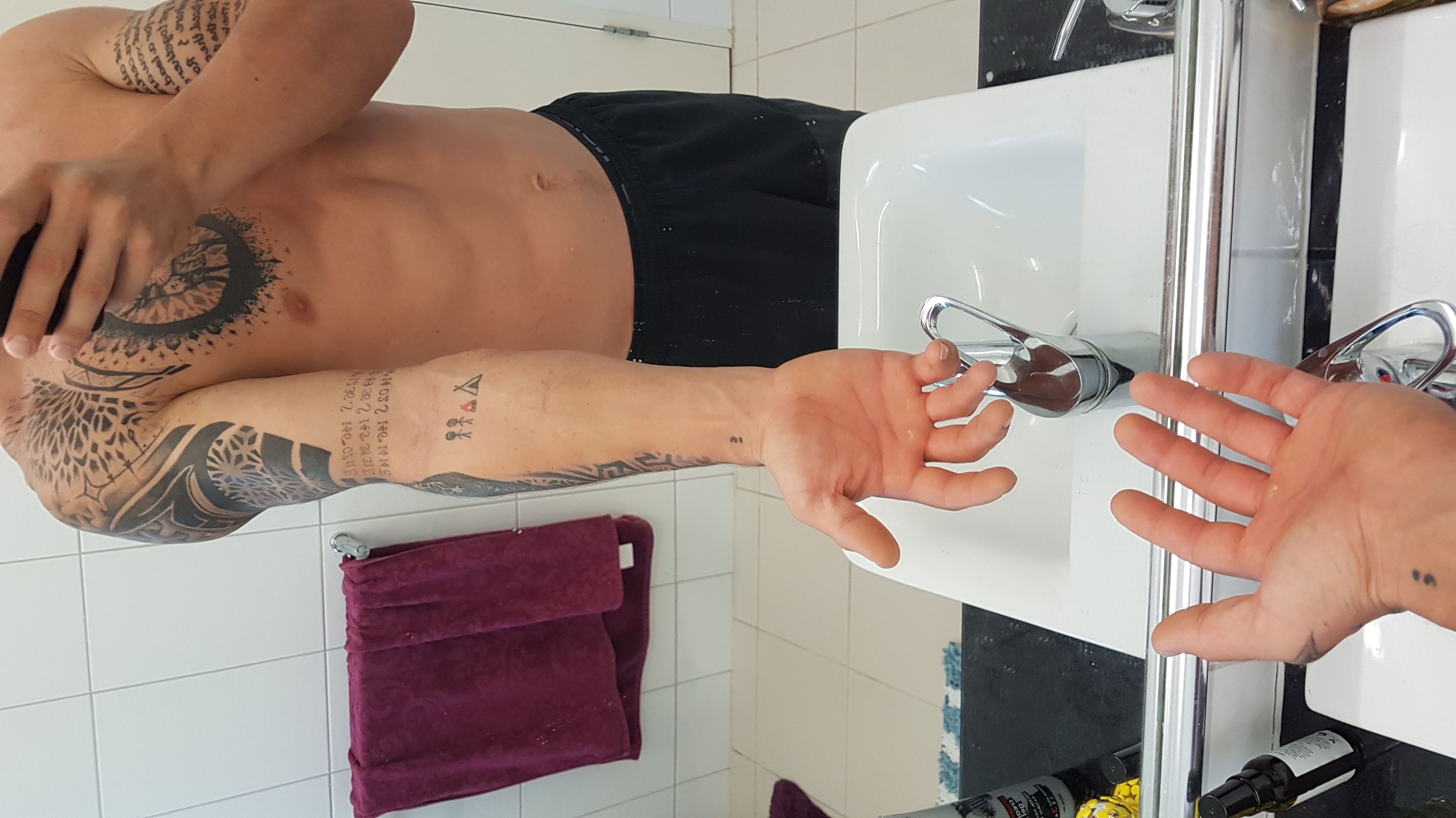 The current tattoo extends up the upper arm and onto the chest. I'm happy with the upper arm and chest, but wouldn't mind altering it in order to fit with your design, if needed. The semicolon on the wrist can be covered, the coordinates just above the elbow can be covered, but I'd like to keep the little stickmen if possible, as that's my brother and me traveling.