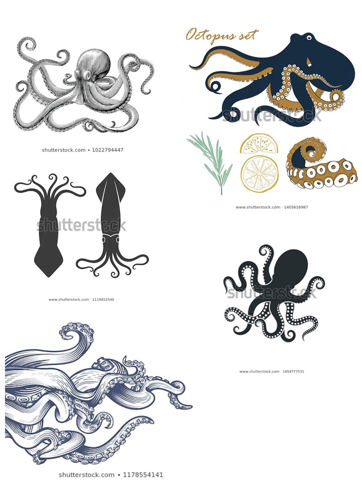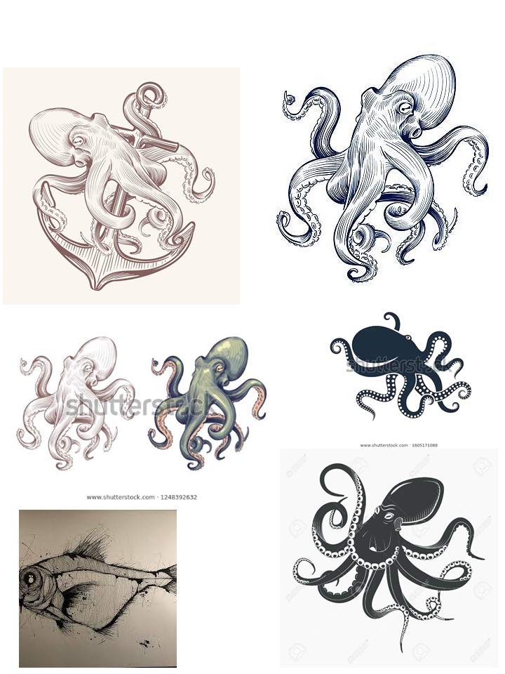 Both should feature cephalopods (Inkfish is a term used for cephalopods like octopuses, squid, cuttlefish and nautiluses. Kraken refers to a mythological giant squid)