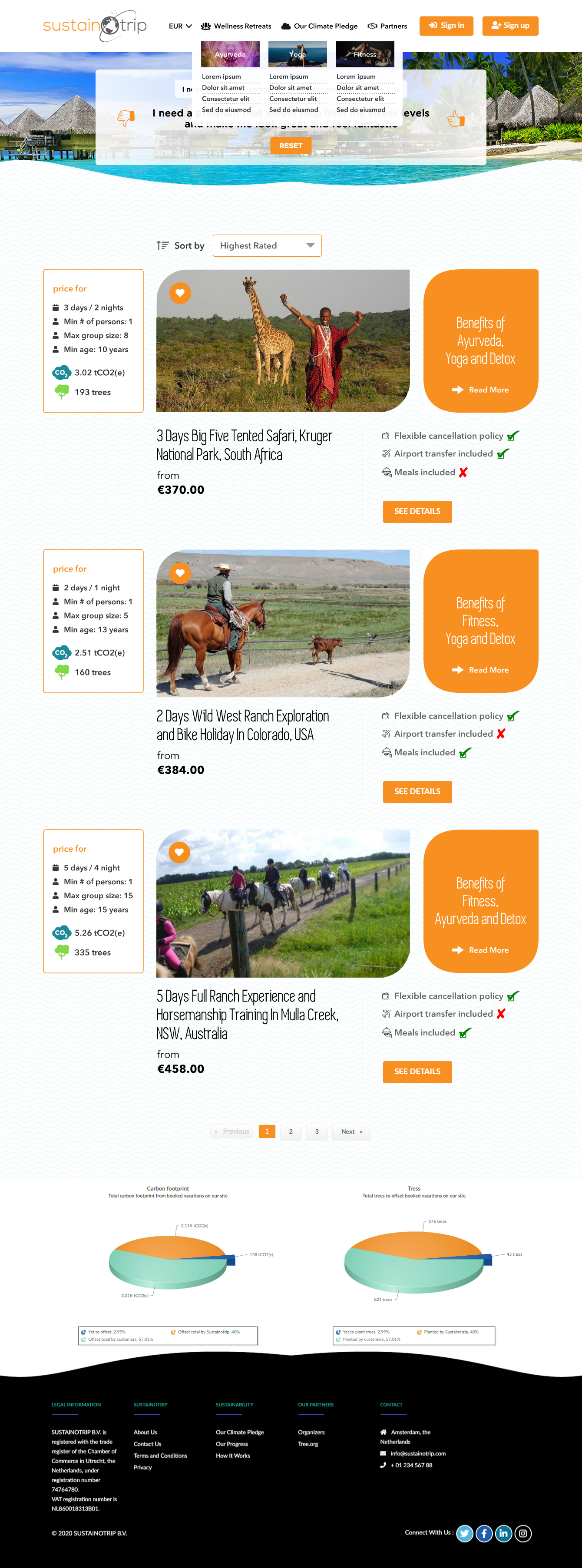 We are a travel/tourism company. We have developed a platform that enables organizers of sustainable theme vacations to publish and make their vacations bookable via our platform. By theme vacations, we mean vacations in categories such as Wellness, Surfing, Culinary, Martial arts, etc. We already have separate websites for each of these categories. This new website you will design is about a parent site where we provide general summary information about these individual sites and link to them. The site would be hosted on the domain sustainotrip.com. Besides information about the individual sites, we also need a menu for About Us, Products and Our Climate Pledge. We also need the following at the home page: