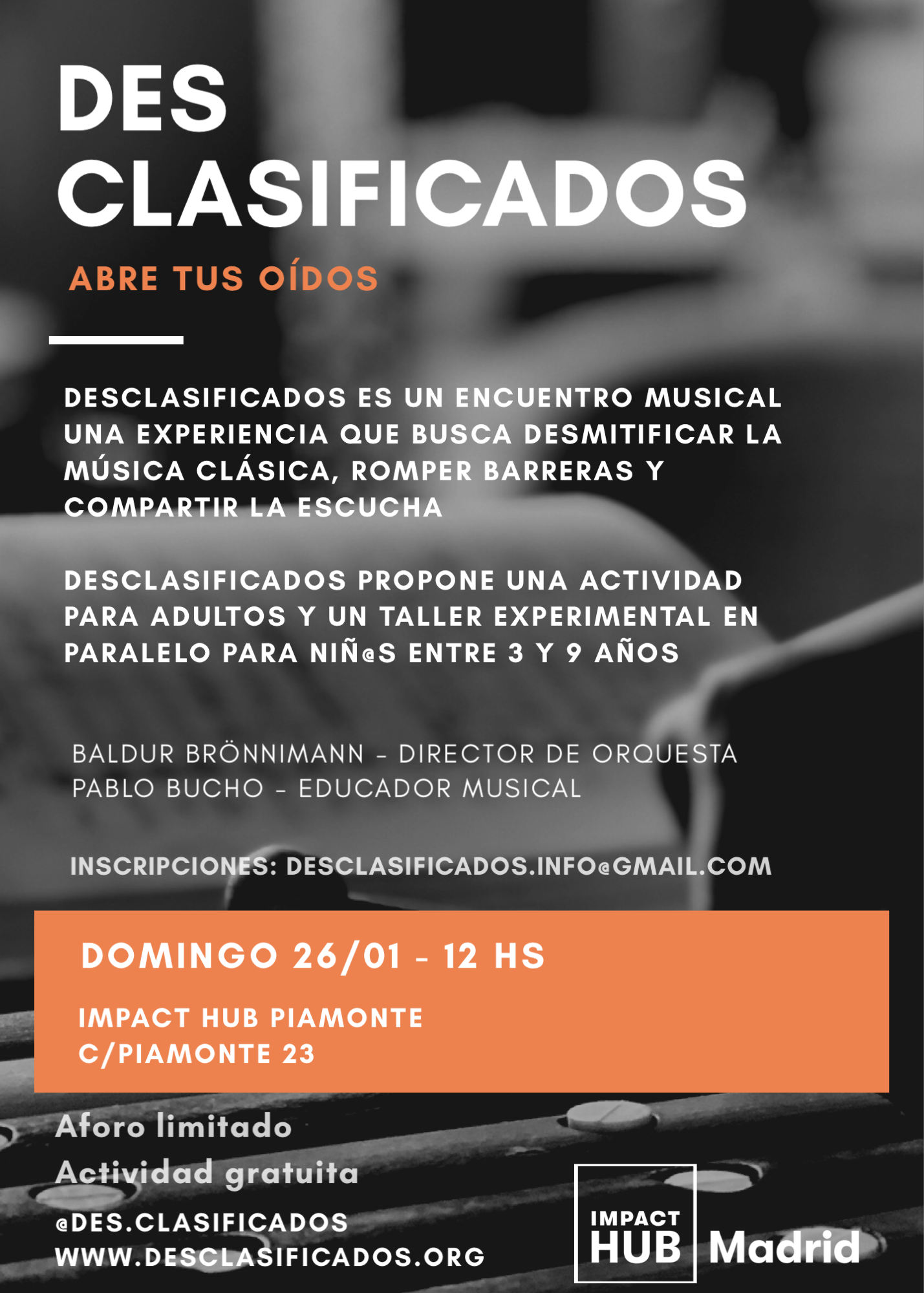 Desclasificados organizes educational projects for adults and children around music, curates classical and contemporary music cycles always keeping in mind to open your ears, reach new audiences, innovate in repertoires and in the ways of approaching concerts. Music is for everyone.