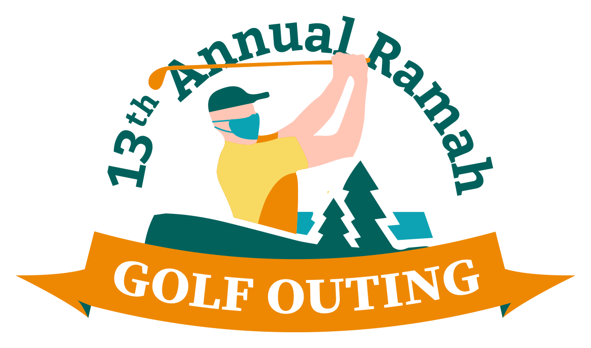Please design a golf outing graphic (event logo) with a golfer with a mask. Text should read Camp Ramah Berkshires 14th Annual Golf Outing. Please demonstrate in the image that there is golf and swimming pool.