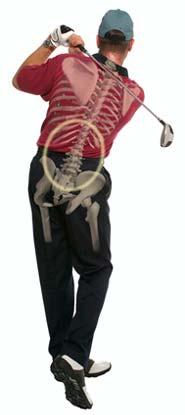 We require an image of a Golfer with club, including outline of skeletal frame highlighting 3 common muscle/bone sore points - shoulder, lower back and knee. These 3 general areas of shoulder, lower back and knee should each be highlighted in clearly identified areas, such as within a circle.