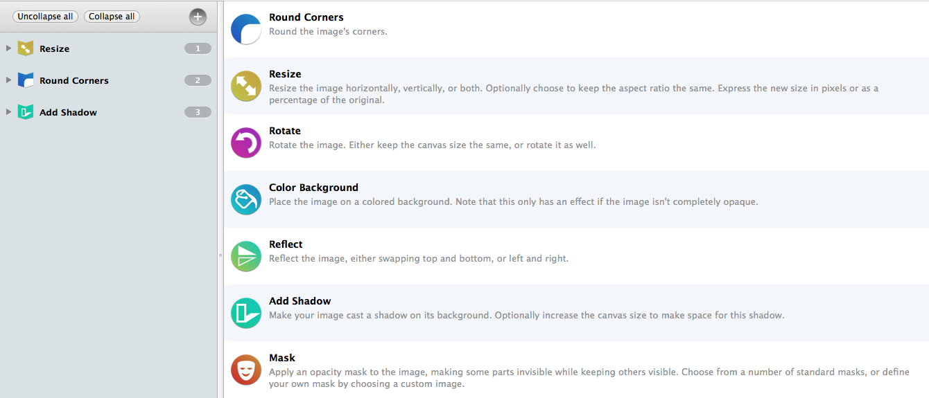 We need an application icon for an app for the Mac that lets users process batches of images. All kinds of image operations – such as resizing, rotating, coloring the background, adding a shadow, rounding corners, adding a border, adding an overlay, etc – can be combined in 'workflows'. Workflows can be saved to disk and be shared with others.