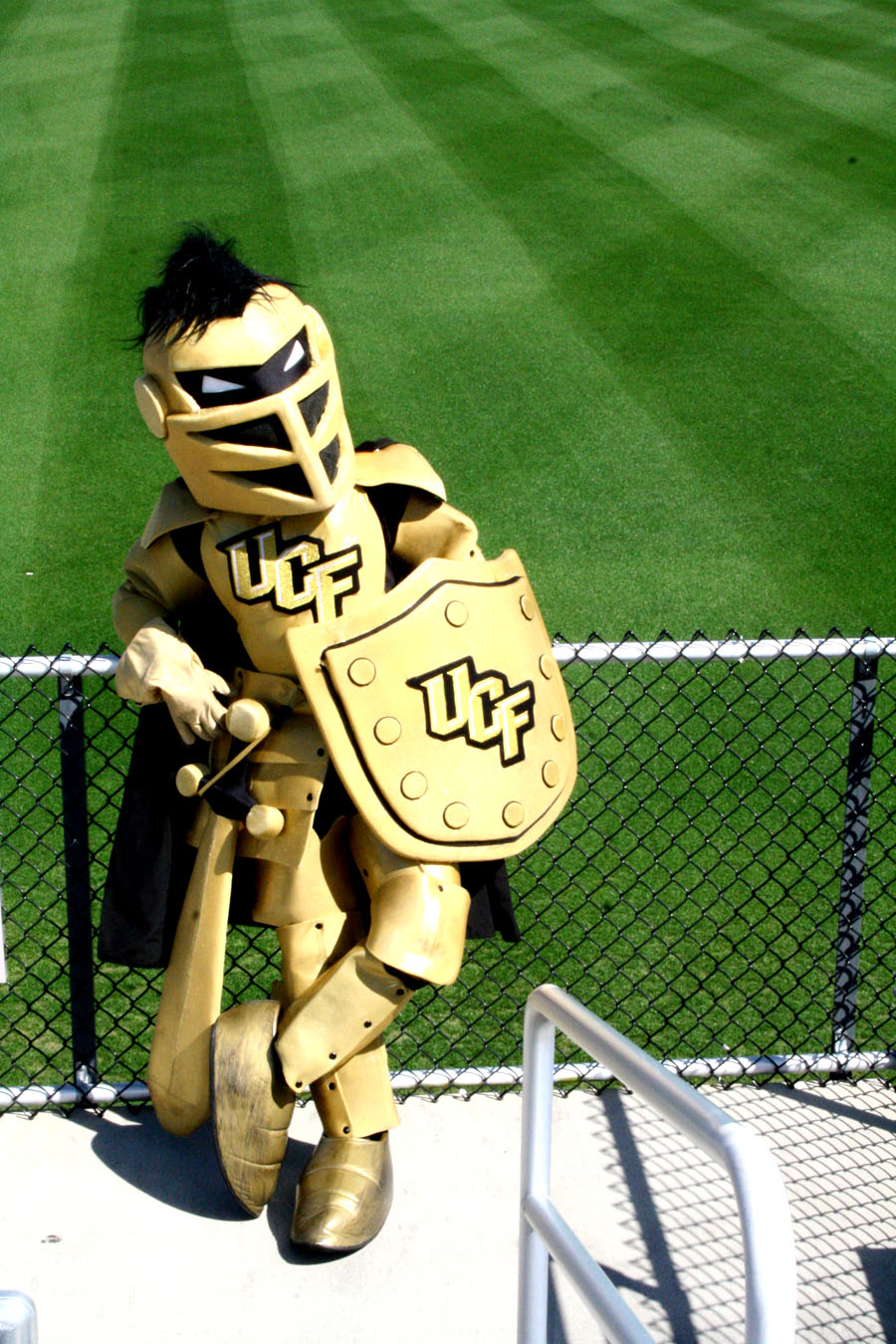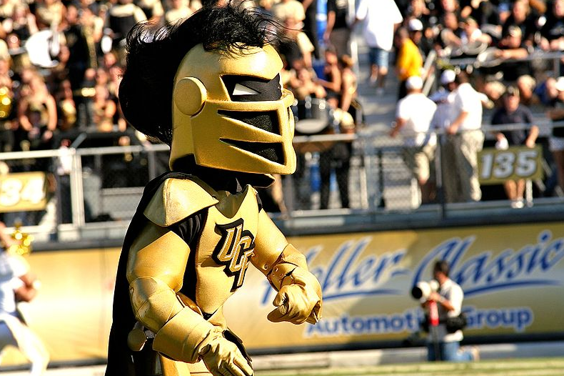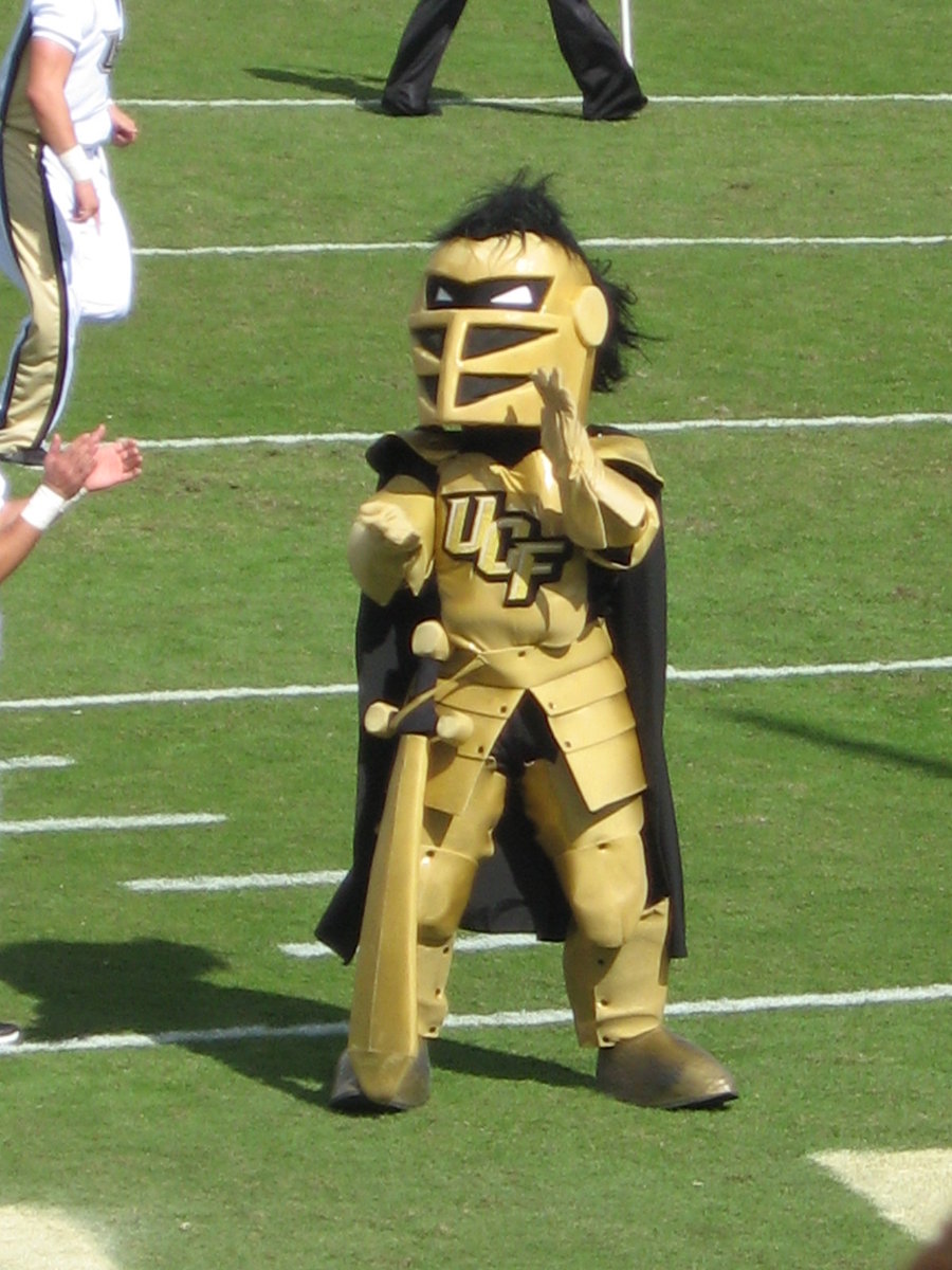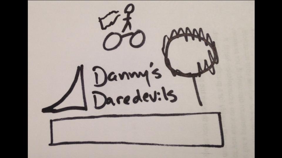 At my university, I assist new incoming students and will need a custom name tag for when they visit for Orientation. The name tag must be able to fit on paper 4 inches wide and 3 inches in length. On the left side, I would like there to be a wooden ramp, and on the right side, a flaming hoop. In the middle of the name tag, I would like my university's mascot "Knightro" to be riding a motorcycle wearing a UCF (university of central florida) cape, jumping off the ramp, heading towards the flaming hoop. Underneath Knightro and in between the ramp and flaming hoop, I would like text that says "Danny's Daredevils." Under the whole design, there should be a white or transparent box where students can write their names. I have included a very amateur drawing of what I would like it to look like, as well as images of Knightro and the stylization of UCF.
