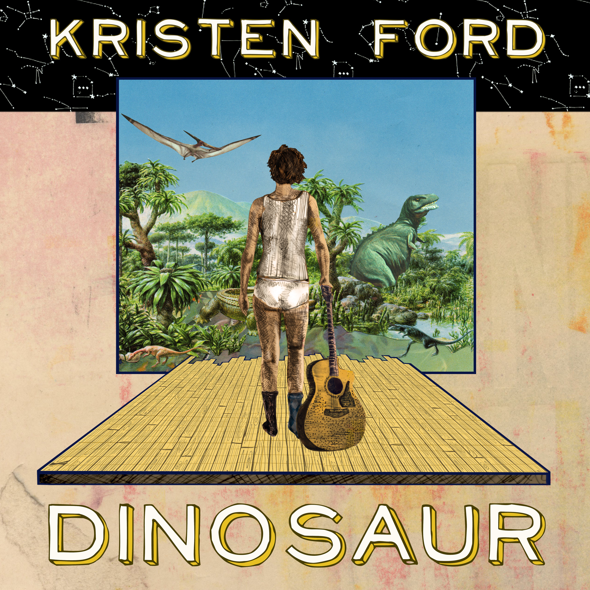 I am an indie rock musician hitting the road to promote my newest full length album "Dinosaur". I need a t shirt that will look great as a one color screen print on a black shirt. This shirt will help me stay afloat on tour and is massively important as CD sales dwindle. Should say KRISTEN FORD