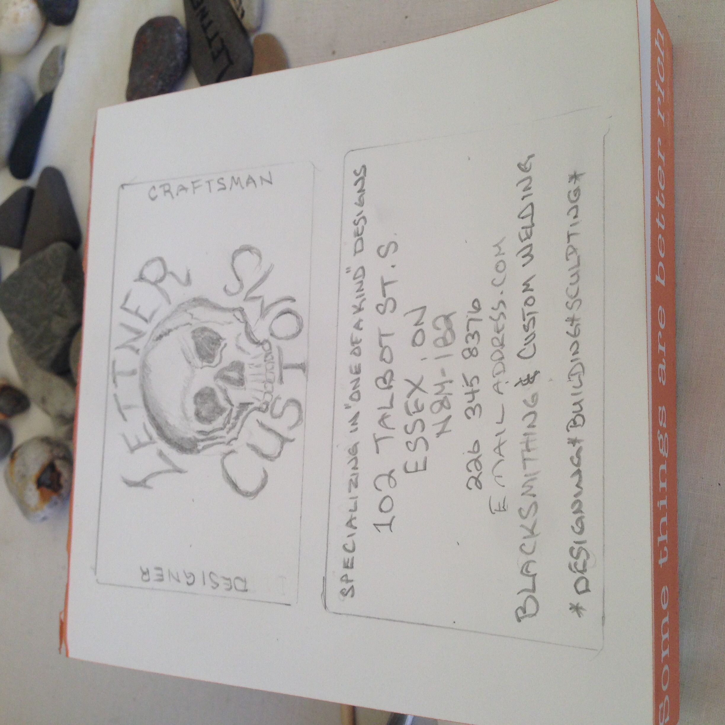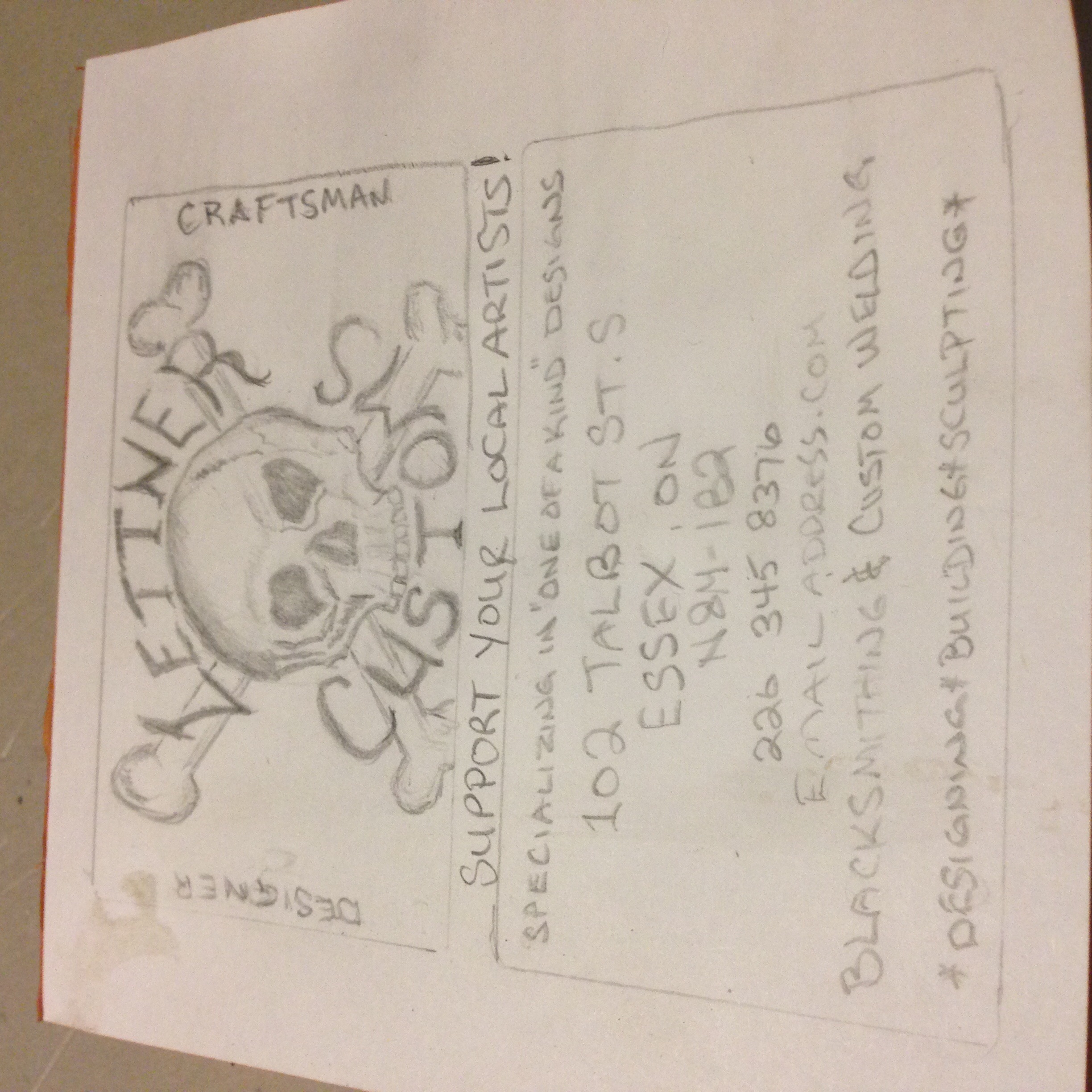Lettner Customs surrounding a skull and cross bones. Street address is 102 Talbot St S Essex ON. Email is LettnerCustoms@gmail.com and telephone number will be 226-787-7322. Use the attached image as a guideline would also like Support your local artist on the card. Our names are Chris and Sydney Lettner