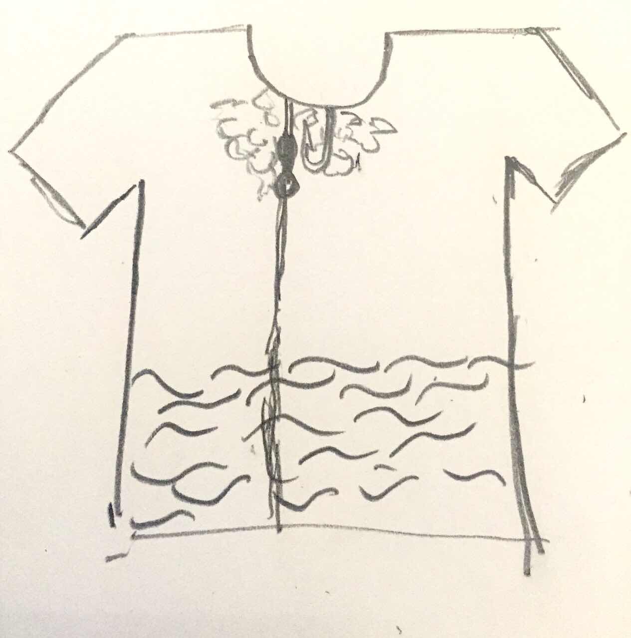 the fish hook has a string until the bottom of the t-shirt where my idea didnt complete of what down there i suggest to be a sea water but i leave it open to your imagination !